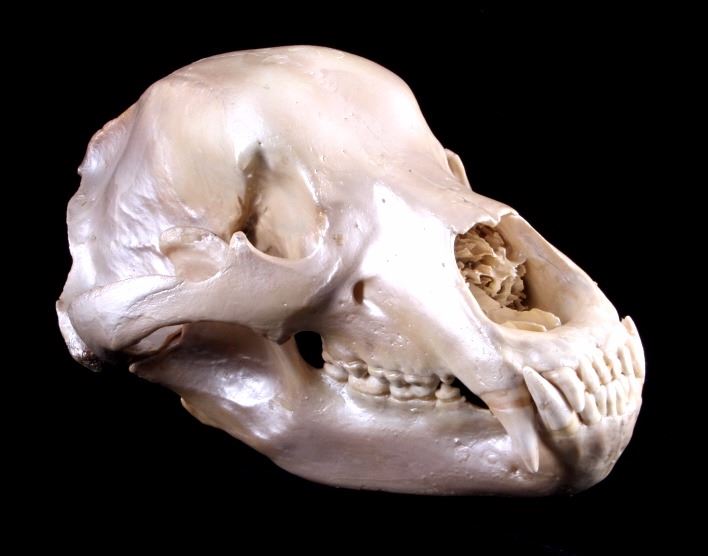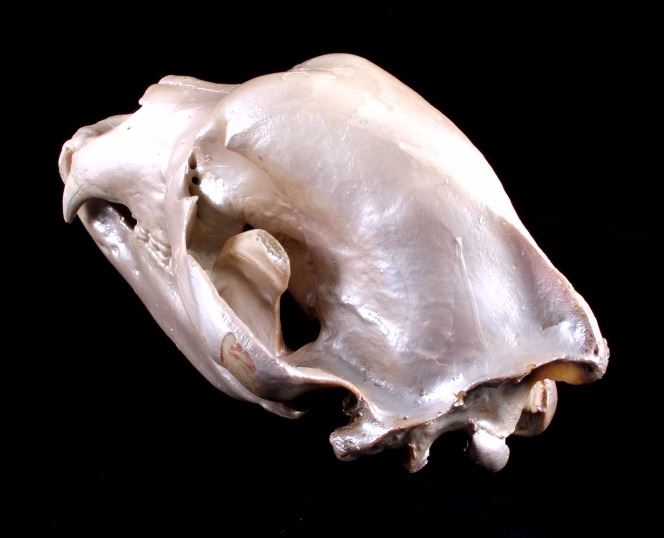 This is a Kodiak Grizzly bear skull from Kodiak Island in Alaska. The skull came from the grizzly bear in the previous lot. The skull is complete and shows exceptional size. The piece has been dipped in a pearl finish for an iridescent look. The Kodiak Grizzly skull is in good condition. It measures 9 1/8" wide and 15 5/8" long.