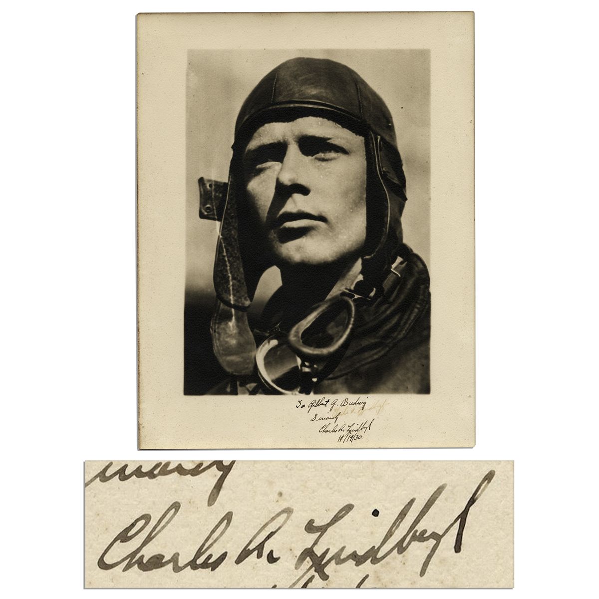 Charles Lindbergh signed sepia-toned photo, dated 19 November 1930 with the border inscribed by the feted aviator: ''To Gilbert G. Budwig, Sincerely, Charles A. Lindbergh, 11/19/30''. Matte photo measures 11'' x 14''. A faint imprint of another signature by Lindbergh is present between the lines of the inscription, likely a showthrough from an item signed atop this one. Overall in very good to near fine condition.