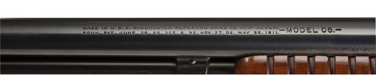 Manufactured post 1932 during the clean-up of production which took a few years. Standard left side barrel markings and caliber marking at the breech, including the Winchester oval proof on the top of the barrel and receiver at the breech. Dovetailed blade front sight and early adjustable rear sight. Mounted with a 12 groove forearm and smooth straight grip stock with a checkered black hard rubber buttplate.