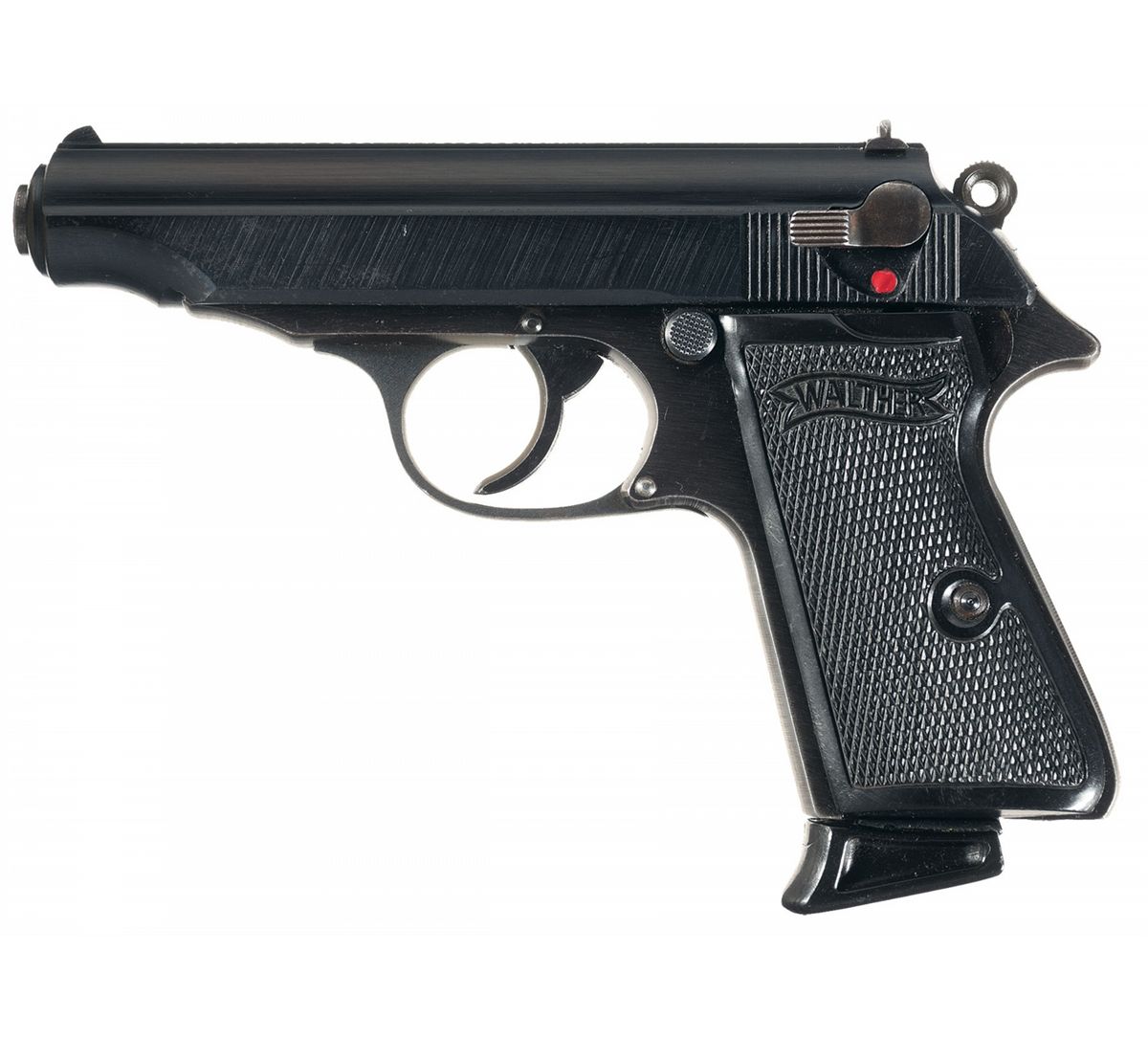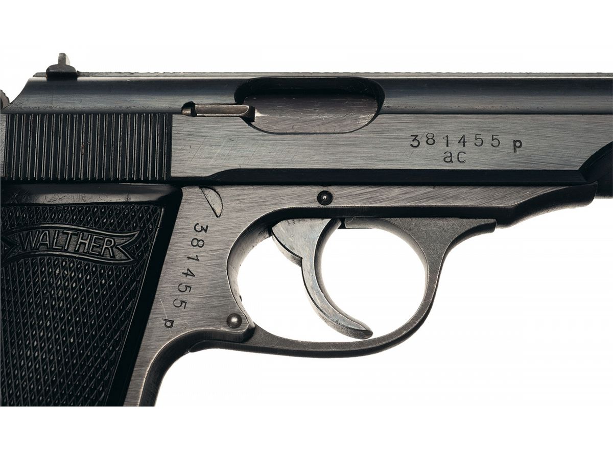Fixed sights with "ac" code on the right side of the slide, and matching numbers on the slide and frame. Equipped with a ring hammer, 60 degree safety, checkered Walther banner grips and matching colored magazine extension.