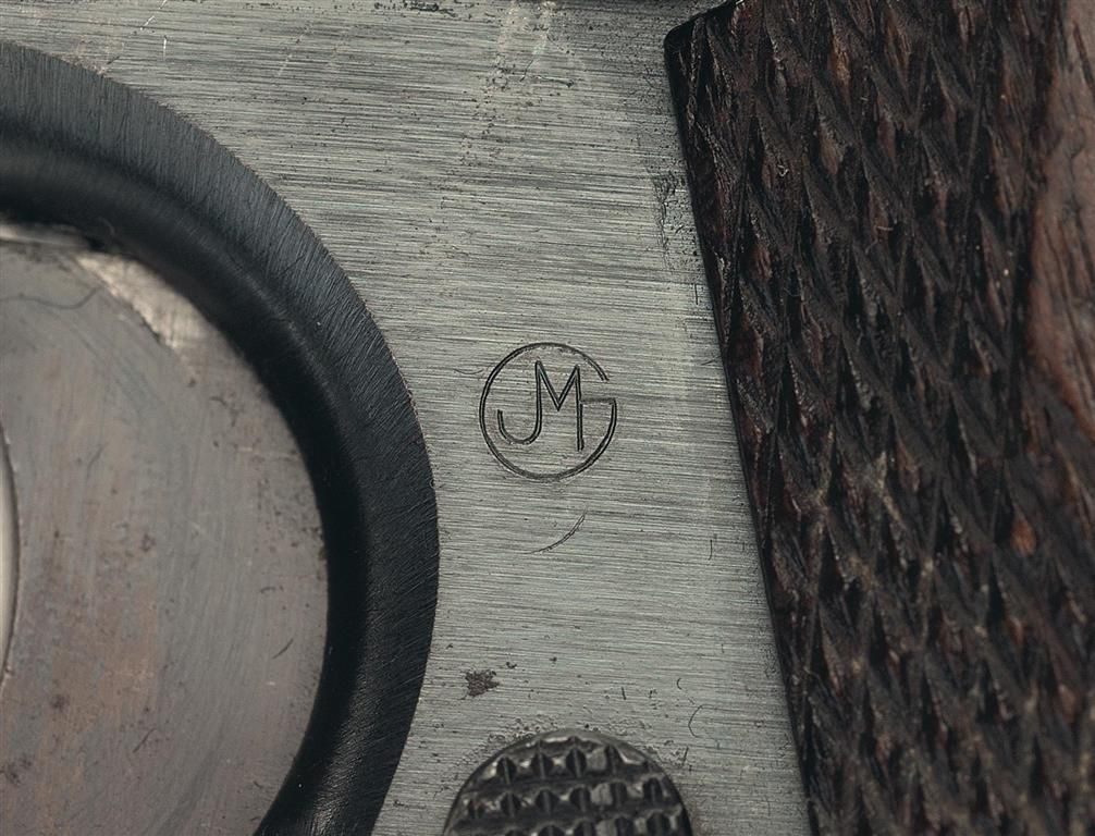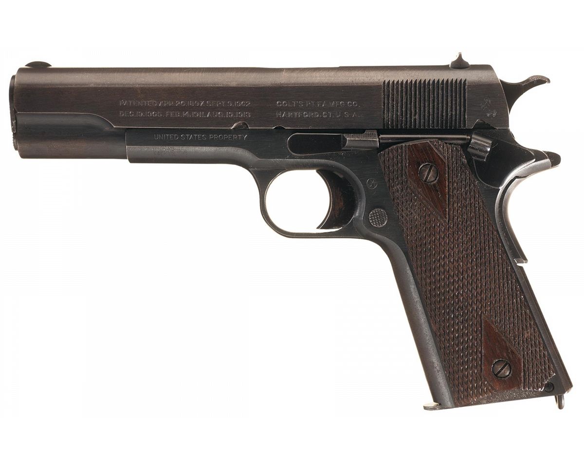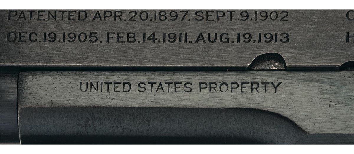 This is a very fine example of an original late WWI U.S. Army contract Model 1911 pistol, as manufactured by the Colt firearms company in late 1918. This pistol was manufactured in the last block of serial numbers at the very end of WWI. Although this pistol is in the last block of serial numbers it is in a unique subset of pistols that has the new later style block letter markings (vs. the earlier serifs letters) but still retains the earlier Colt military brushed blue finish and not the late "Black Army" finish. The left side of the slide has the standard Colt factory two-line, two-block markings with the Rampant Colt behind the slide serrations. The right side is marked "MODEL OF 1911 U.S. ARMY". The left side of the frame is marked "UNITED STATES PROPERTY" and has the circled "JMG" proof of LTC J.M. Gilbert, above the magazine release and the right side is stamped with the serial number "230835" of the pistol. The pistol still retains the correct original WWI parts such as the checkered Colt wide spur hammer, flat main spring housing, checkered slide stop and thick type III thumb safety. It is fitted with a WWI Colt barrel that is marked over the chamber area with the separated "H" and "P" proofmarks with a single number "5" on the underside in front of the lug. This fine pistol still retains the original WWI Colt diamond pattern checkered walnut grips and is complete with one half-tone magazine.