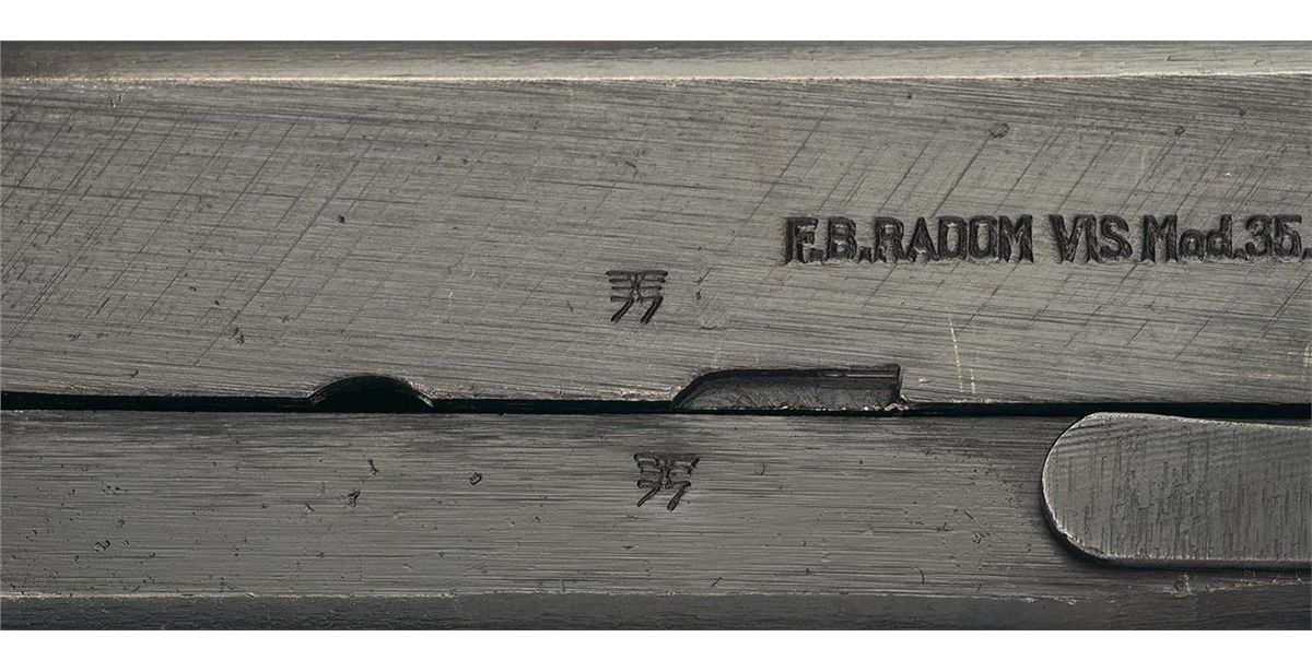 This is an excellent late WWII Polish Radom pistol that still retains the all blue finish, but lacks the safety lever and has the unstained later grips. This example exhibits the standard one line slide markings of a single "Waffenamt/77" proof followed by "F.B. RADOM VIS Mod 35 Pat. Nr. 15567/P.35(p)" followed by an "Eagle/swastika" firing proof and "Eagle/623" acceptance mark. The frame also has the single "Eagle/77" Waffenamt proof. Both the slide and frame exhibit rough machining marks and the slide and barrel are numbered to the gun. It is fitted with the standard unstained walnut grips with the serrations on the sides of each grip.