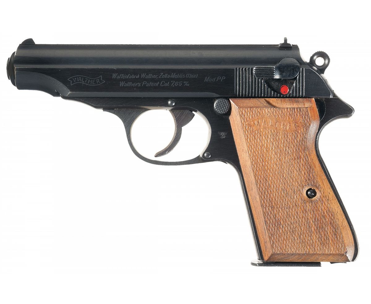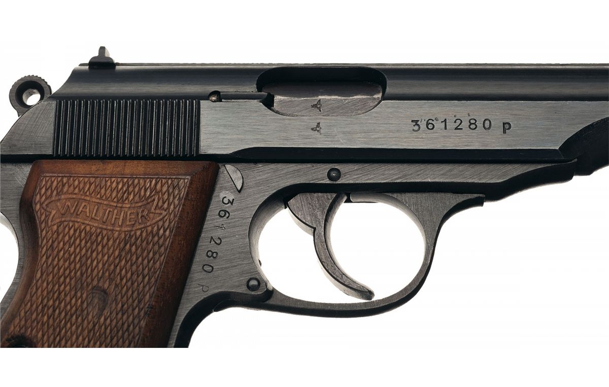This pistol has the standard manufacturer's markings on the left side of the slide with the "Eagle F" police proof behind the trigger. Commercial "eagle/N" proofs are on the slide, chamber and barrel with matching numbers on slide and frame. Fitted with checkered hardwood Walther banner grips. Magazine is marked with the Walther banner over "PP 7,65 m/m".