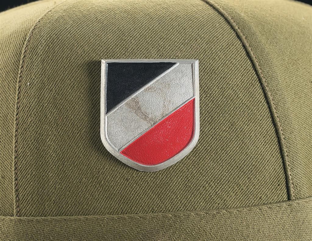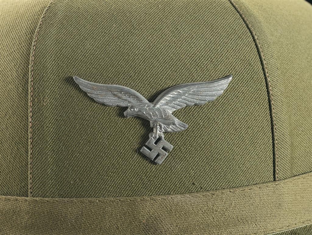 Exterior is green canvas over a cork body, with the crown constructed from six panels and the brim from 2 panels. With the dome-topped vent on top, an alloy Luftwaffe eagle on the left, national tricolor shield on the right, a green band protecting the chinstrap and sweatband hardware, brown leather edge trim and a matching colored chinstrap. The interior has a six-panel red cloth lining with the number six on the front-right panel, a tan leather sweatband with a makers mark impressed on the right side and the interior ink-stamped "56", "ORL" and "1942".