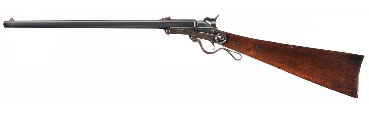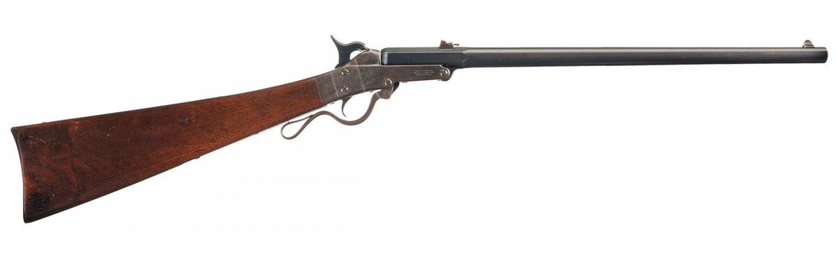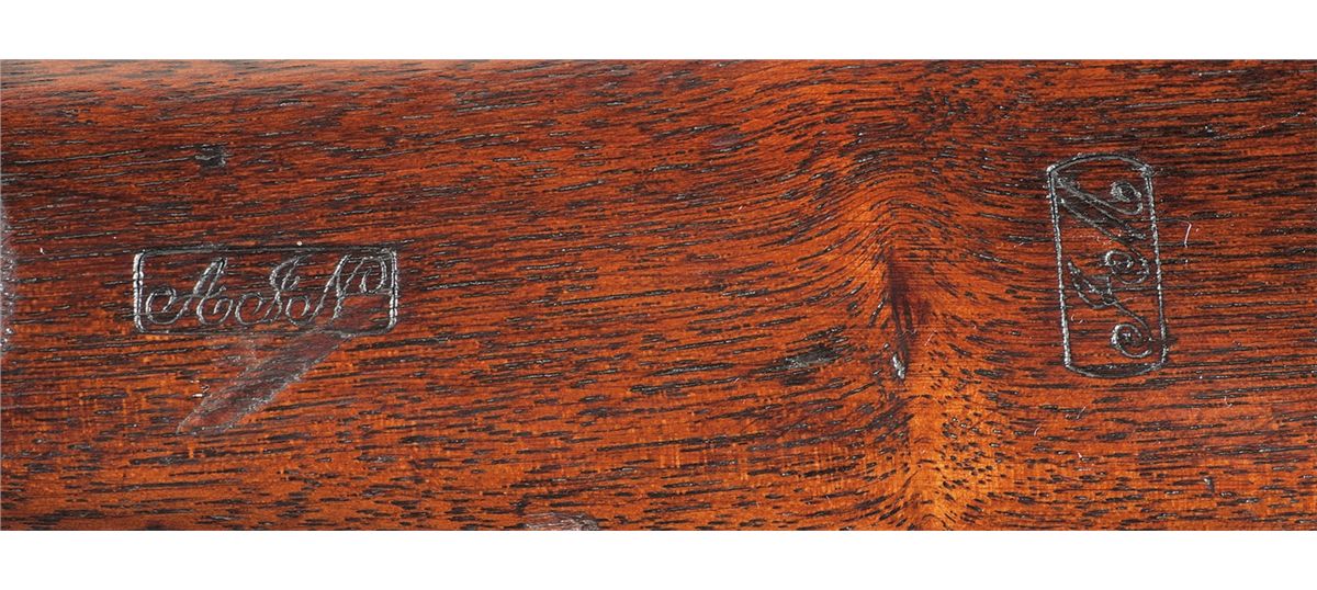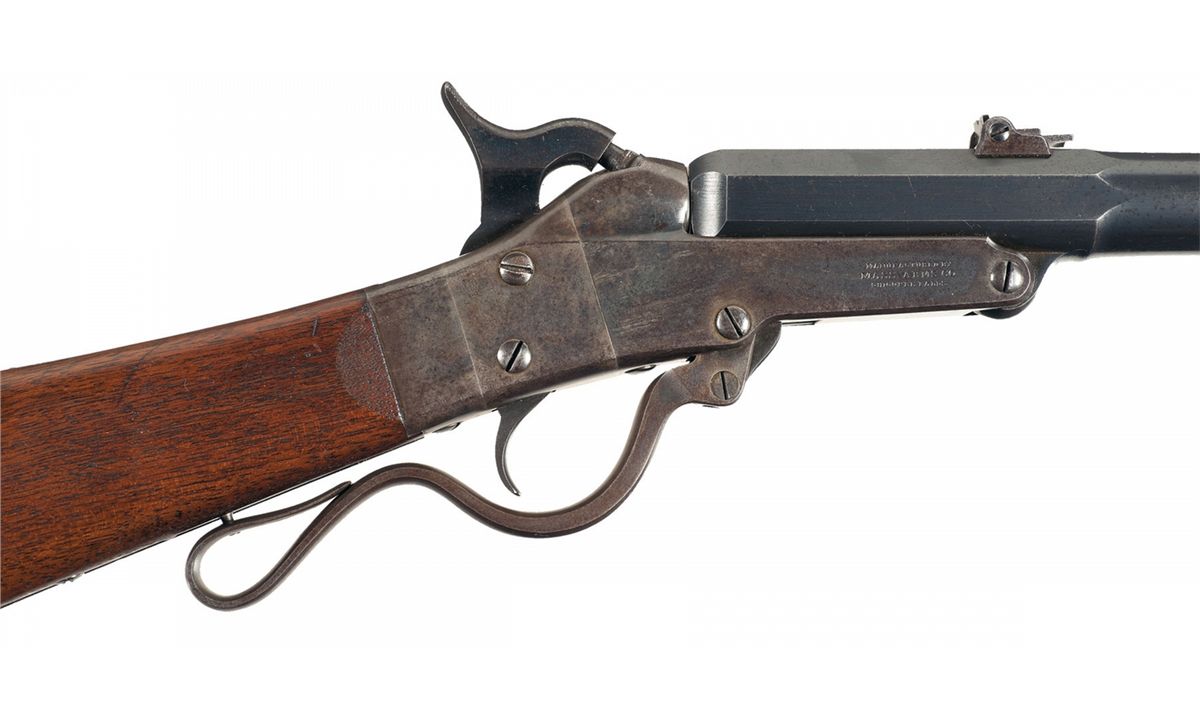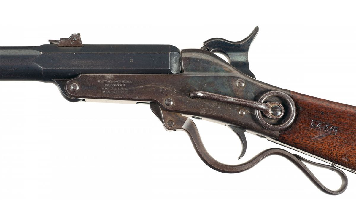 This is an excellent example of a Second Model Maynard Patent Civil War carbine that was manufactured from 1863 to 1865 by the Massachusetts Arms Co. of Chicopee Falls, Massachusetts. This variation was also known as the "Model 1863". These carbines were issued to Union cavalry units during the Civil War, among those regiments were the 9th and 11th Indiana and the 11th Tennessee. The left side of the frame is marked "EDWARD MAYNARD/PATENTEE/MAY 27 1851/DEC 6 1859" and "MANUFACTURED BY/MASS. ARMS CO./CHICOPEE FALLS" on the right side. The serial number appears on the lower tang. The barrel is fitted with a pinched blade front sight and a three leaf rear sight, with the leafs marked "1", "3" and "5". The left side of the rear sight base is marked with the letter "N" and the left side barrel flat is marked with the letter "S". The letter "N" is also on the saddle ring base and the "S" on the buttplate tang. The barrel is blue, niter blue hammer and casehardened remaining parts. There is a saddle ring and bar mounted on the left side of the frame and the carbine is mounted with a smooth oil finished walnut straight grip stock with a sharp script "AJN" and "JM" boxed cartouches on the left wrist and a small "N" on top just ahead of the buttplate tang. The stock is correctly without a patch box.