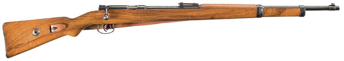 This Mauser sporting rifle is equipped with a ramped blade front sight and tangent rear sight graduated to 200 meters. The left side of the barrel at the breech end is marked "KAL. 22 LANG FUR BUCHSEN" followed by the serial number and "459" and crown over "B", "U" and "G" proof marks. The left side of the receiver is marked with a crown "B" and "U" proof followed by the matching serial number and "MAUSER_WERKE A.G. OBERNDORF A.N.". The top of the receiver is marked with the Mauser banner and the right rear "DEUTCHES SPORTMODELL". Mounted with a smooth one piece walnut pistol grip stock with missing cleaning rod. Complete with a brown leather sling.