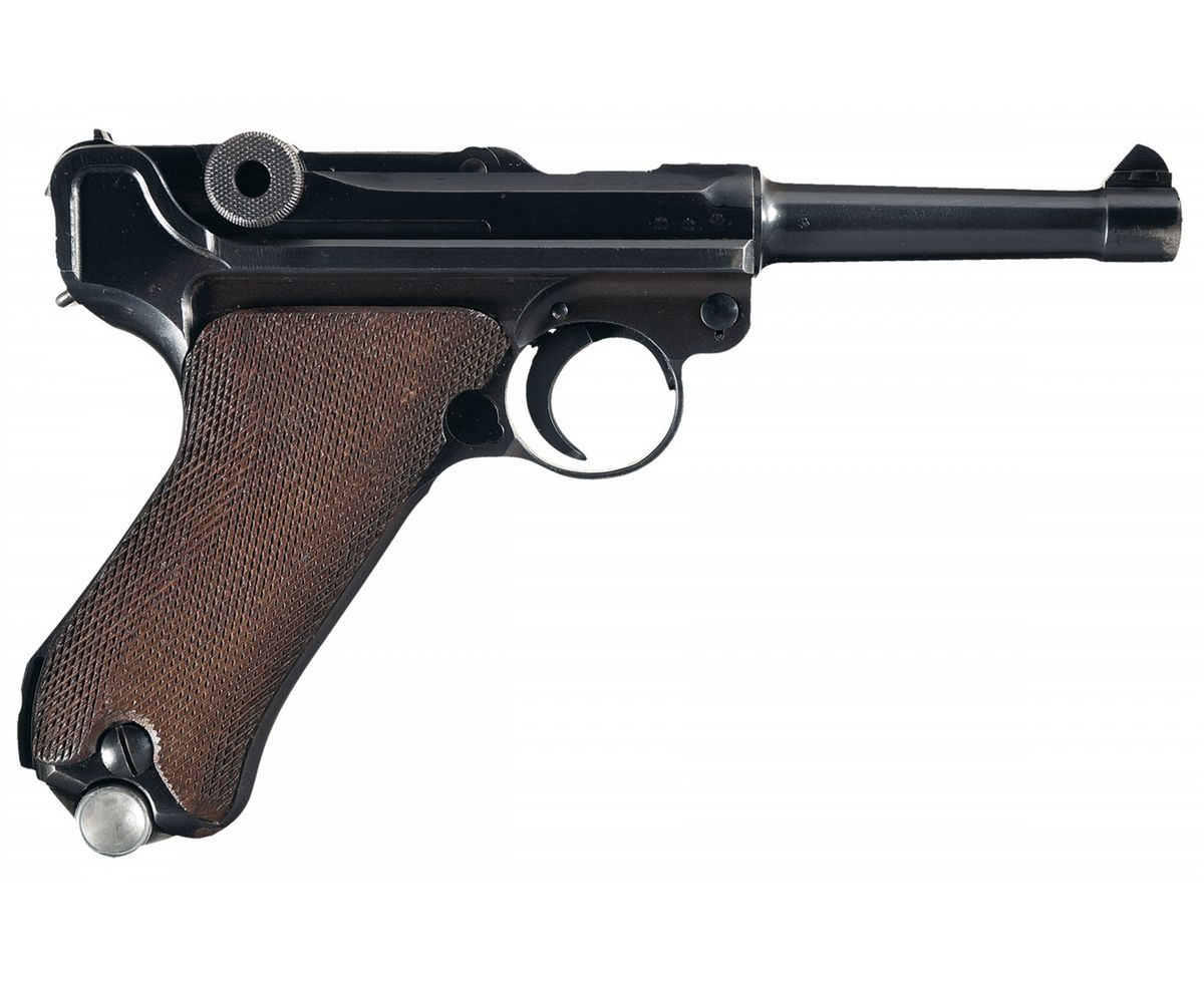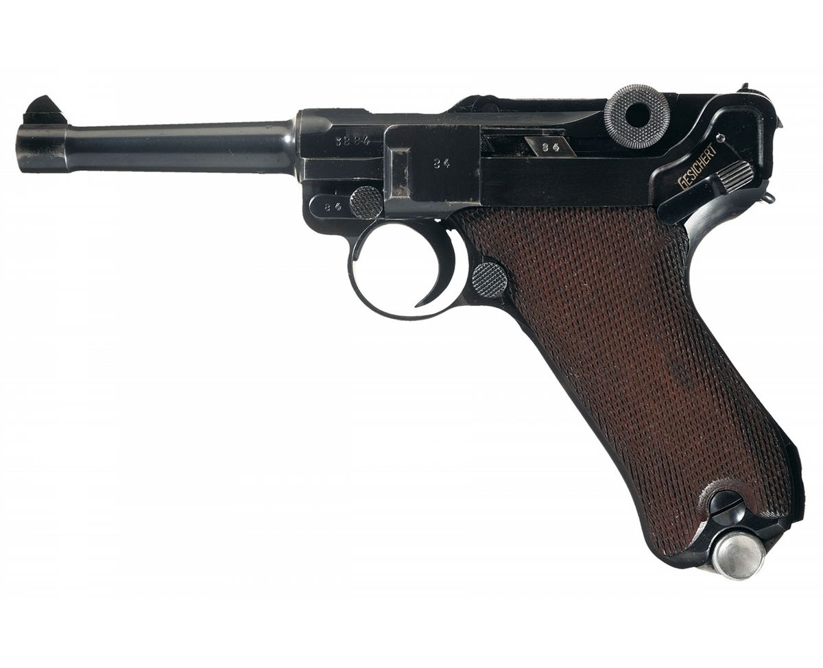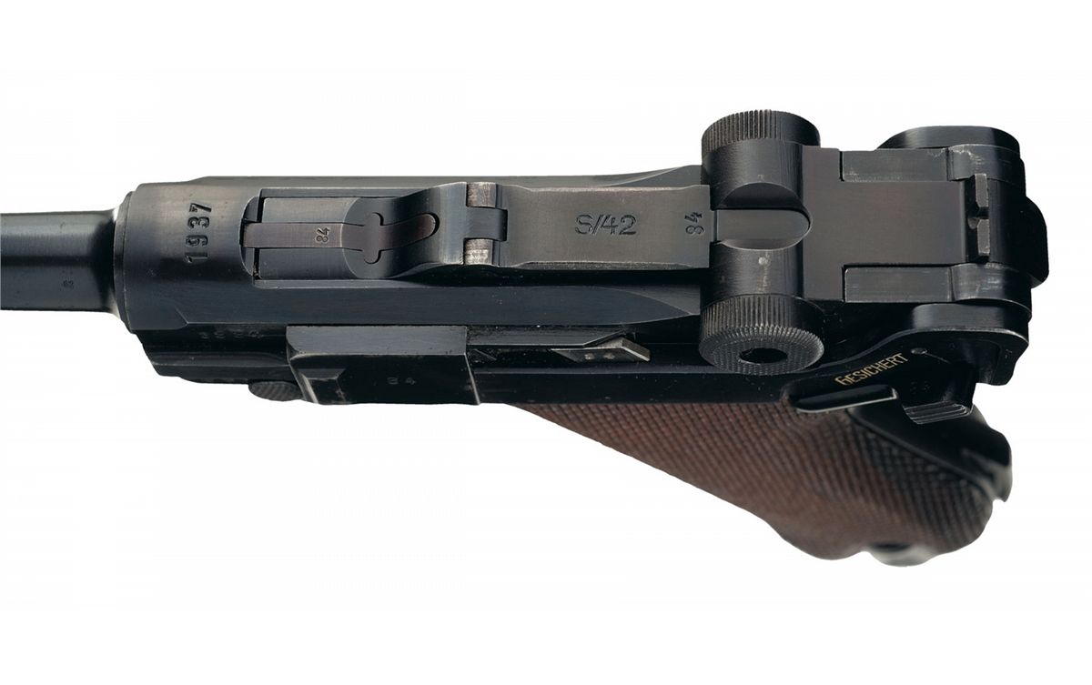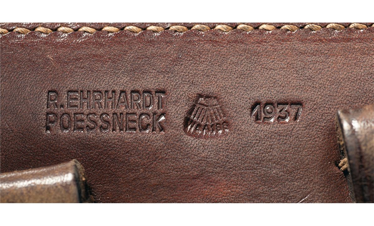 This is a very nice example of a 1937 dated Mauser Luger pistol rig. The top of the chamber is dated 1937 and it has the "S/42" code marking on the front toggle. It has the "Eagle/63" Waffenamt proofs on the barrel extension and barrel. There is a single eagle firing proof also on the barrel extension, barrel and breechblock. It is correctly marked "GESICHERT" and "GELADEN" on the safety area and extractor, respectively. It is complete with two original matching magazines that have the blue, folded sheet metal steel bodies, with the aluminum bases that are marked "3884/t/Eagle/63" and "3884/t/+/Eagle/63". This Luger is complete with a very nice WWII brown leather holster that is marked on the back side "R.EHRHARDT/POESSNECK", "eagle/WaA186" and "1937" and an original "eagle/63" Waffenamt proofed takedown tool.