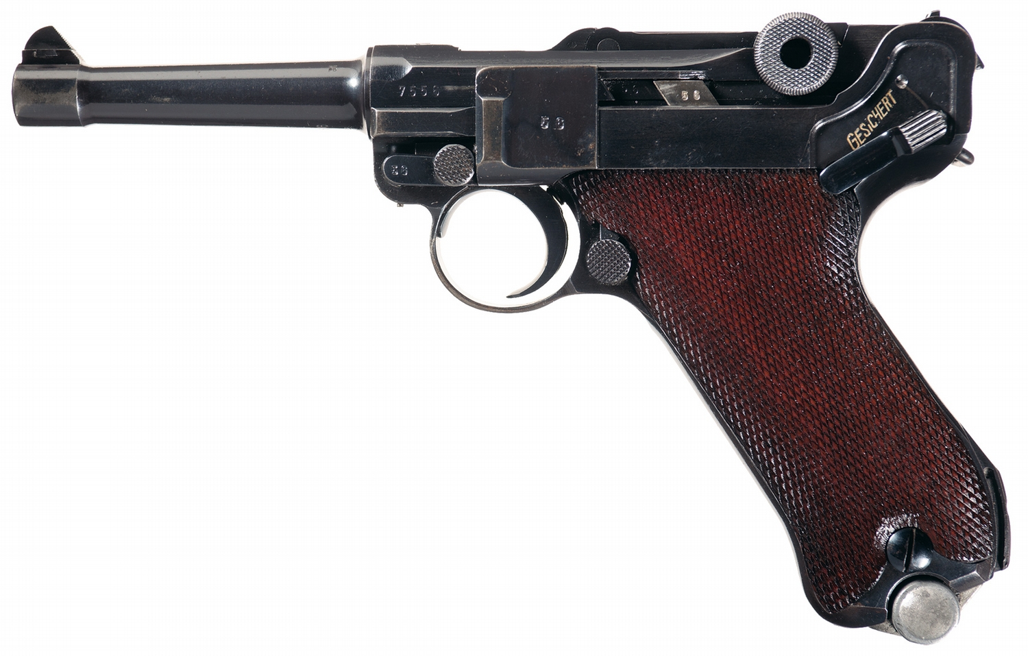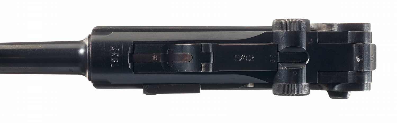 Fixed sights, dated 1937 on the chamber, with the "S/ 42" code on the toggle. "Eagle/ 63" proofs on the extension and barrel, with eagle firing proofs on the extension, barrel and breechblock. Matching numbers on several parts. "GESICHERT" and "GELADEN" on the upper safety area and extractor, respectively. Checkered hardwood grips and blue magazine with aluminum base numbered to match the gun.