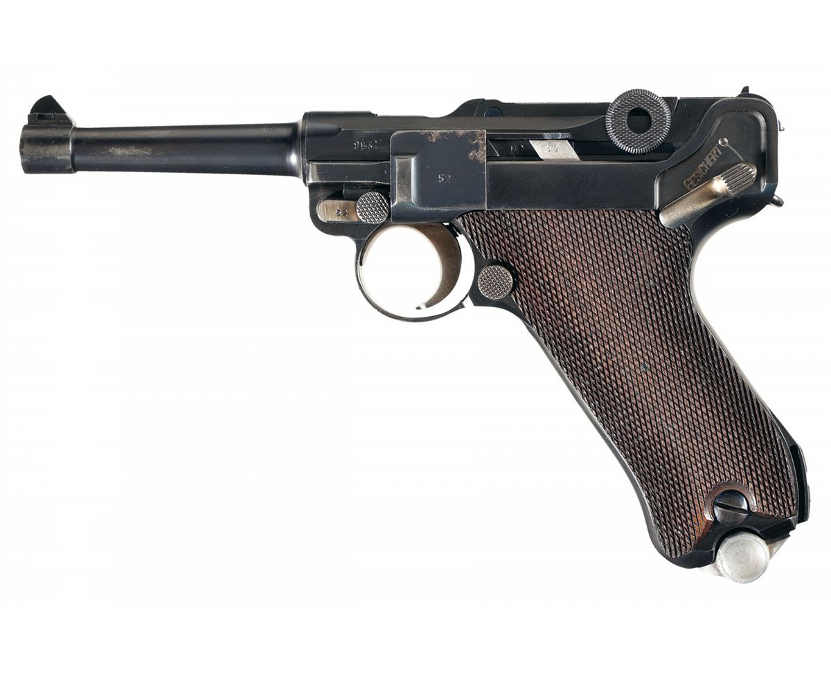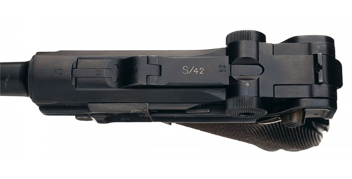 This is an excellent example of a early WWII German Luger pistol manufactured by Mauser in 1935. Pistols manufactured in the 1926-1935 time frame used a letter code on top of the chamber area to designate the year of manufacture in lieu of an actual number. These letter codes were intended to disguise the rearmament effort in Germany that was on-going in the early 1930s. The "G" designates manufacture in 1935. The top of the toggle has the "S/42" markings designating the Mauser factory with the "G" over the chamber area. The right side of the barrel extension is marked with two droop stick wing eagles over "63"and droop stick wing eagle proofs, with the latter repeated on the right rear of the barrel. The underside of the barrel is marked with the matching serial number and the bore diameter "8,82". The matching serial number is also marked on the left side of the barrel extension and the front of the frame, with the last two numbers "52" on most of the small components. The magazine is blue with an aluminum base marked "N 3347/1663/l" and a stick wing over "63" proof. Rust blue finish with straw colored small parts and fitted with checkered walnut grips.