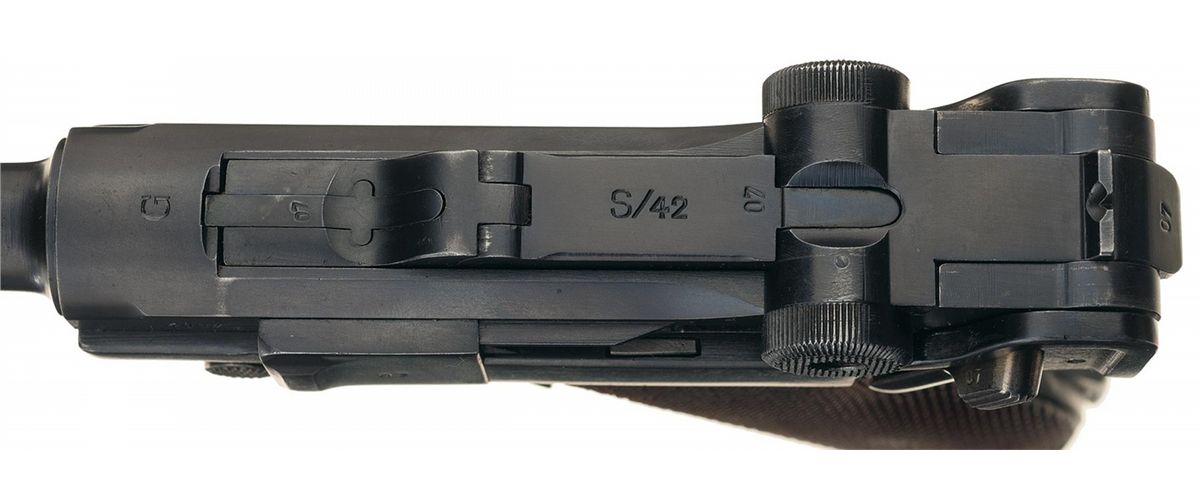 This is an excellent example of a early WWII German Luger pistol manufactured by Mauser in 1935. Pistols manufactured in the 1926-1935 time frame used a letter code on top of the chamber area to designate the year of manufacture in lieu of an actual number. These letter codes were intended to disguise the rearmament effort in Germany that was on-going in the early 1930s. The "G" designates manufacture in 1935. The top of the toggle has the "S/42" markings designating the Mauser factory with the "G" over the chamber area. The right side of the barrel extension is marked with a droop stick wing eagle, stick wing eagle over "211" and the boxed "s 92". The underside of the barrel is marked with the matching serial number and the bore diameter "8,82". The matching serial number is also marked on the left side of the barrel extension and the front of the frame, with the last two numbers "07" on most of the small components. The magazine is blue with an aluminum base marked "3697/n". Blue finish with straw colored small parts and fitted with checkered walnut grips.