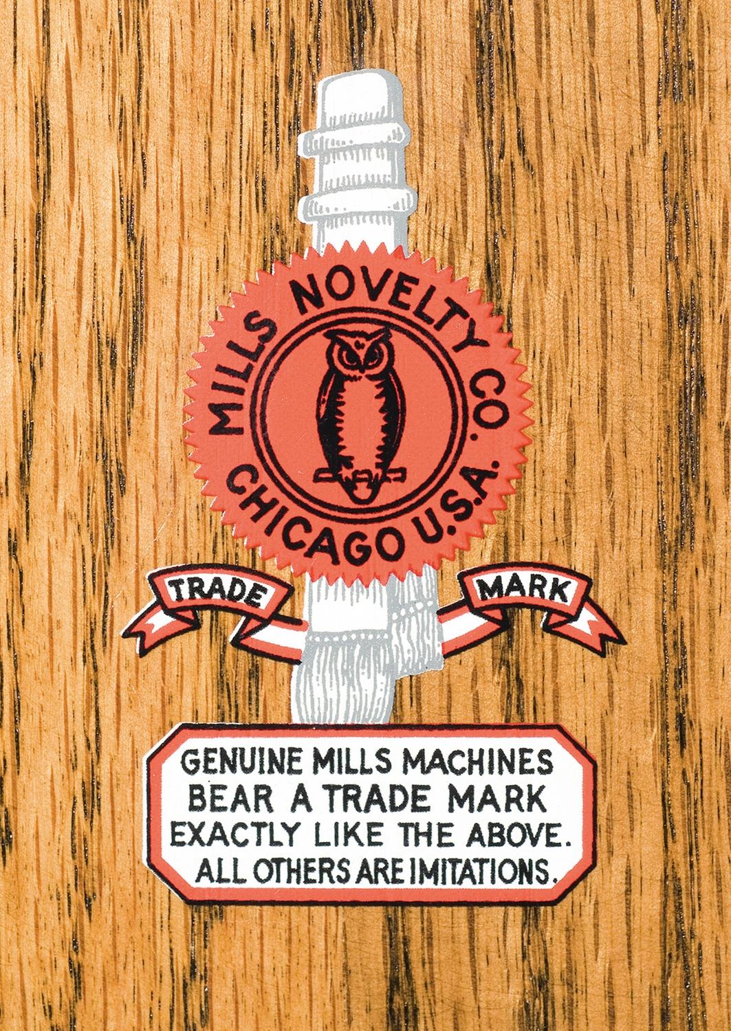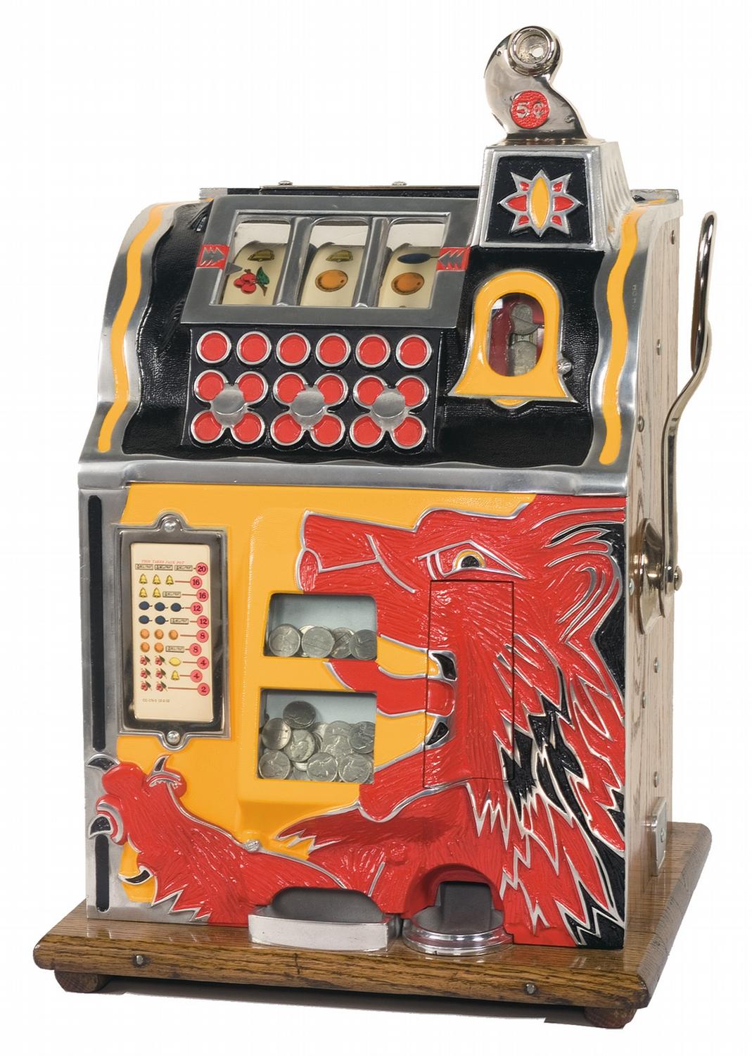 Founded in 1891, Mills Novelty Company of Chicago was a producer of slot machines up through the 1980s. The machine is 16" wide, 15 deep and 25" tall including the wood base, with wood panel sides, Mills trademark on the left, and black, yellow and chrome finished front, with a red and black lion dominating the lower section. Three drums, with jackpot window and 2-coin drop feed vertical escalator. With key, instruction form inside the rear cover and 1997 dated factory maintenance tag.