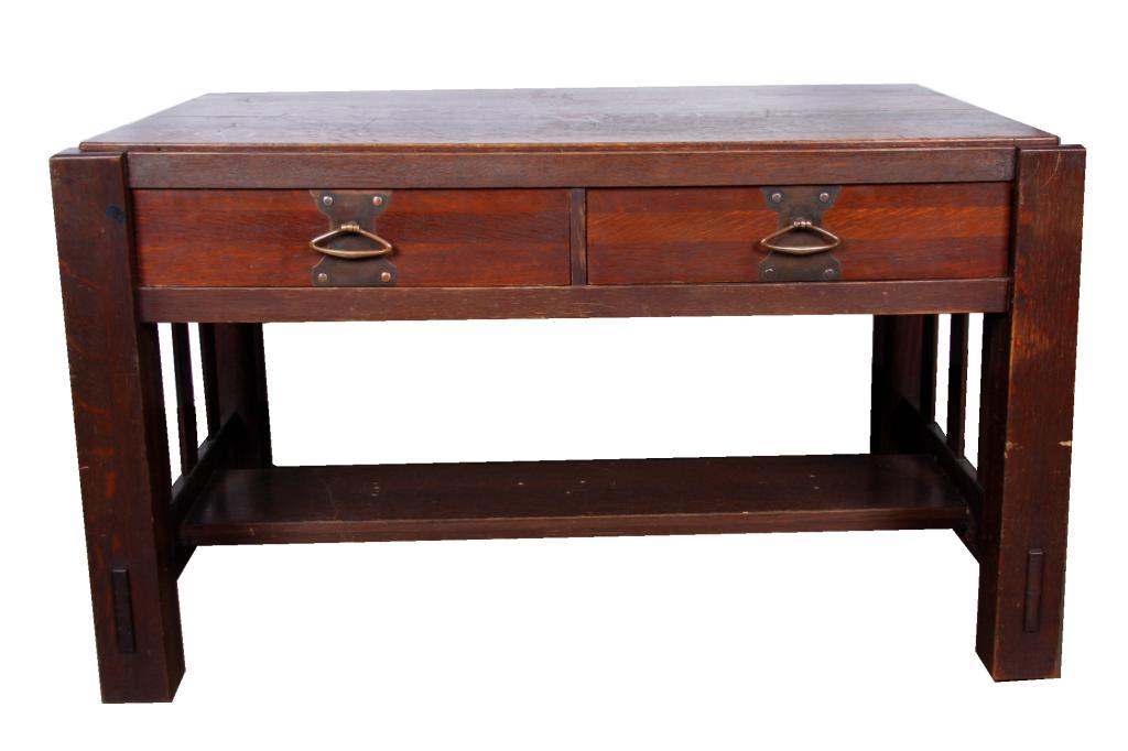 Excellent Mission Oak Desk with 2 drawers. The desk is reportedly to be Stickley, however, we cannot find a label verifying this information. Overall good condition. Shows age with some scratching on top, and minor loss to right side. Original hardwawith 2 drawers. The desk is reportedly to be Stickley, however, we cannot find a label verifying this information. Overall good condition. Shows age with some scratching on top, and minor loss to right side. Original hardwareintact. 48"L X 31"W X 30"H.