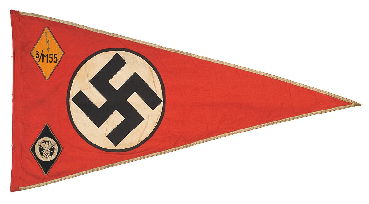 Formed in 1930, the Nationalsozialistiches Kraftfahr-korps (National Socialist Motor Corps), in addition to its responsibilities for drivers education, also trained mechanics, boat pilots and radiomen. Double sided pennant, measuring 44 3/4" long, 23 3/4" wide, with a red field, gold border, reinforced tip, cloth swastika and field, embroidered NSKK patches at the bottom and patches for signal unit Staffel 3, Motorstandarte 55 (roughly Signal Squadron 5, 55th Motor Regiment) at the top, cloth with embroidered lightning bolt. See included image. This item is pictured on pg. 189 of "NSKK, NSFK Uniforms, Organization & History" by J. Angolia & D. Littlejohn (1994).