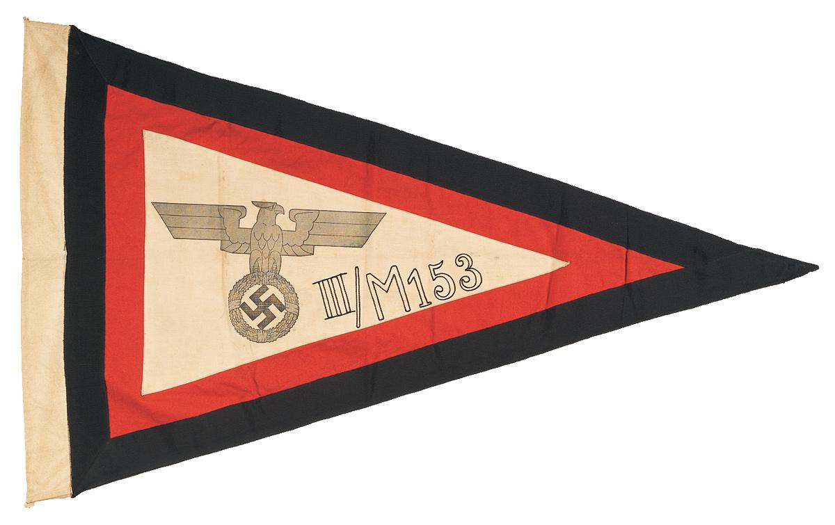 In existence from 1930 to 1945, the Nationalsozialistiches Kraftfahr-korps (National Socialist Motor Corps), had an active role in providing trained drivers for the military. Double sided pennant, measuring 32" long and 19 1/2" wide, with black and red borders around a white field, printed Nazi eagle logo and black thread embroidered "III/ M153" (Staffel 3, Motorstandarte 153, translated Squadron 5, 153th Motor Regiment). See included image for colors and layout. This item is pictured on pg. 196 of "NSKK, NSFK Uniforms, Organization & History" by J. Angolia & D. Littlejohn (1994).
