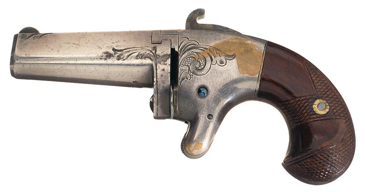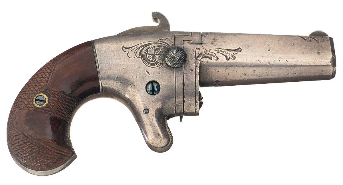 Produced during the 1860s. Fixed sights, with "NATIONAL ARMS CO BROOKLYN. N.Y." on top of the barrel. Scroll engraving is present on the barrel and frame, with serrated hammer and trigger, and checkered bird's head grips. Matching "AM 15" assembly numbers on the left side of the backstrap and on the grips, with "1979 JOHN AVRIES" scratched into the right side of the butt and frontstrap under the grip.