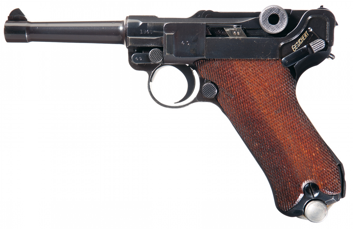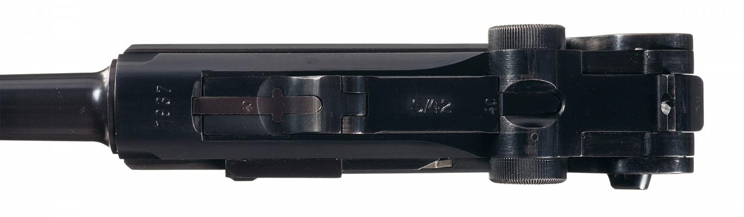 This is a 1937 production Mauser P08 Luger pistol that is finished in the all blue configuration. The top of the chamber is dated "1937" and the front toggle has the wartime code of "S/42" for the Mauser factory at Oberndorf. The right side of the barrel extension has two early stick wing "eagle/63" Waffenamt proofs next to the single eagle firing proof. There is a "eagle/63" proof also marked on the left rear of the barrel and the firing proof on the right rear. Matching numbers including each grip panel. It has the standard extractor and safety markings. Rust blue finish on all the metal surfaces, correctly including the small parts and blue unmarked magazine with the aluminum base marked with a stick wing "eagle/65" proofmark. Fitted with checkered walnut grips.