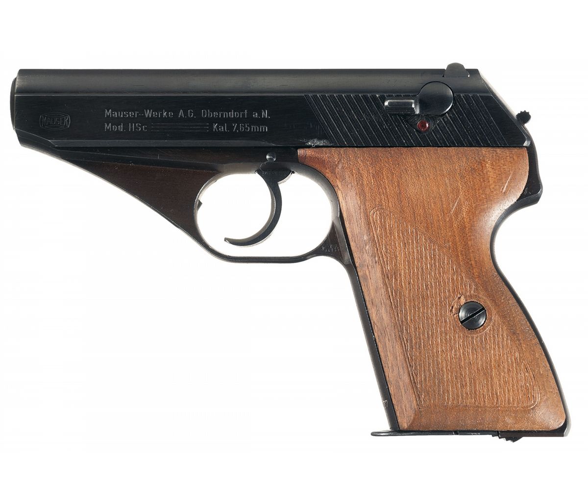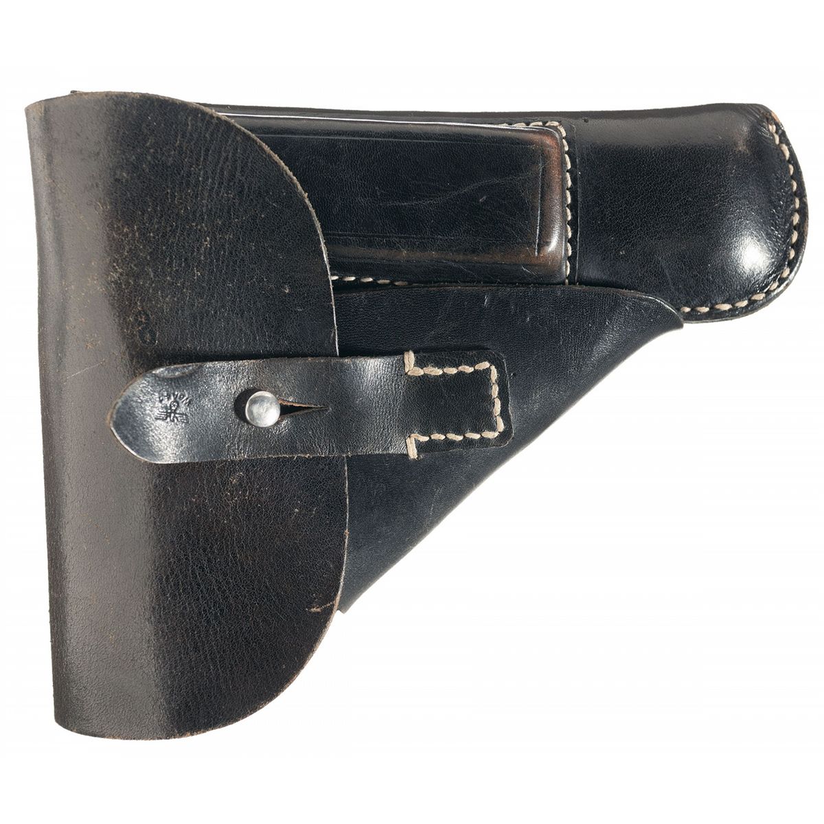 Condition: Excellent. The pistol retains 98% plus original blue finish showing some light edge wear near the muzzle. There is an extremely small spot of pitting present on left side of lower slide immediately forward of the slide serrations. The grips are very fine with some chipping around the screw (left panel) and a few minor pressure dents. Mechanically excellent. Holster is very fine with flex wear and minor handling marks. The stitching is tight.