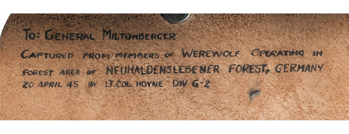 The slide has the Mauser banner and two line legend on the left side and the trigger guard is marked with an "eagle/WaA135" proof and "eagle/N" commercial proof. With two magazines total and "jhg 44" coded leather holster. Inside of the holster flap is hand marked in ink: "TO: GENERAL MILTONBERGER/CAPTURED FROM MEMBERS OF WEREWOLF OPERATING IN/FOREST AREA OF NEUHALDENSLEBENER FOREST, GERMANY/20 APRIL 45 BY LT. COL. HOYNE DIV G-2." Miltonberger saw action with the 4th Division in the Argonne during WWI. In 1940 he commanded the 134th Infantry, 35th Infantry Division. During WWII he saw action in the European Theater which included St. Lo, Vire, Mortain, Montargis, Morhange Serreguemines, Batogne, and Elbe River. He was made Assistant Division Commander of the 35th in 1945 and became Chief, National Guard Bureau in 1946 with the rank of Major General.