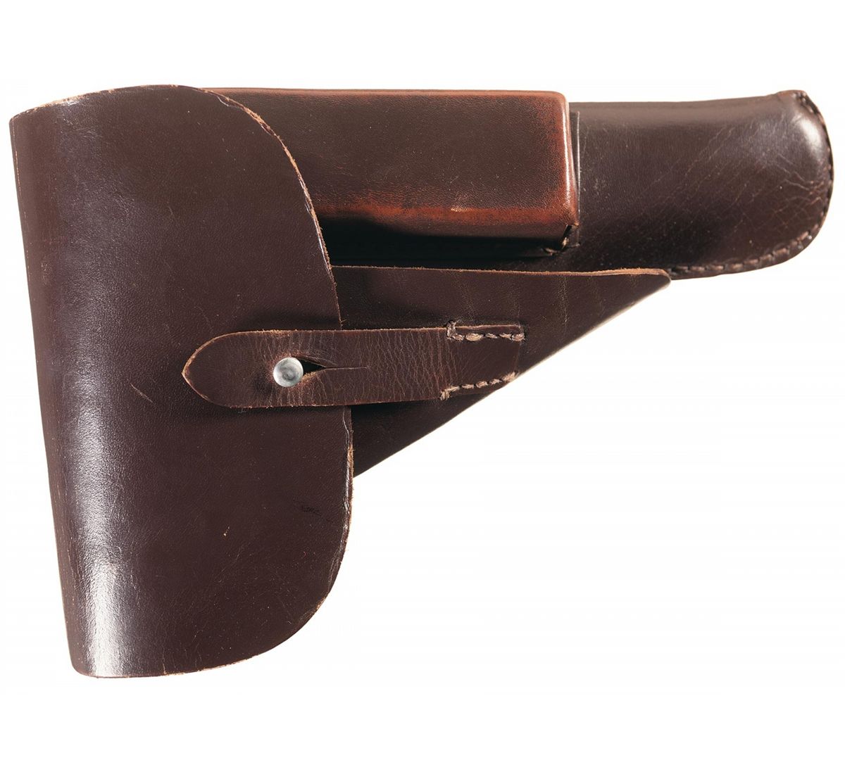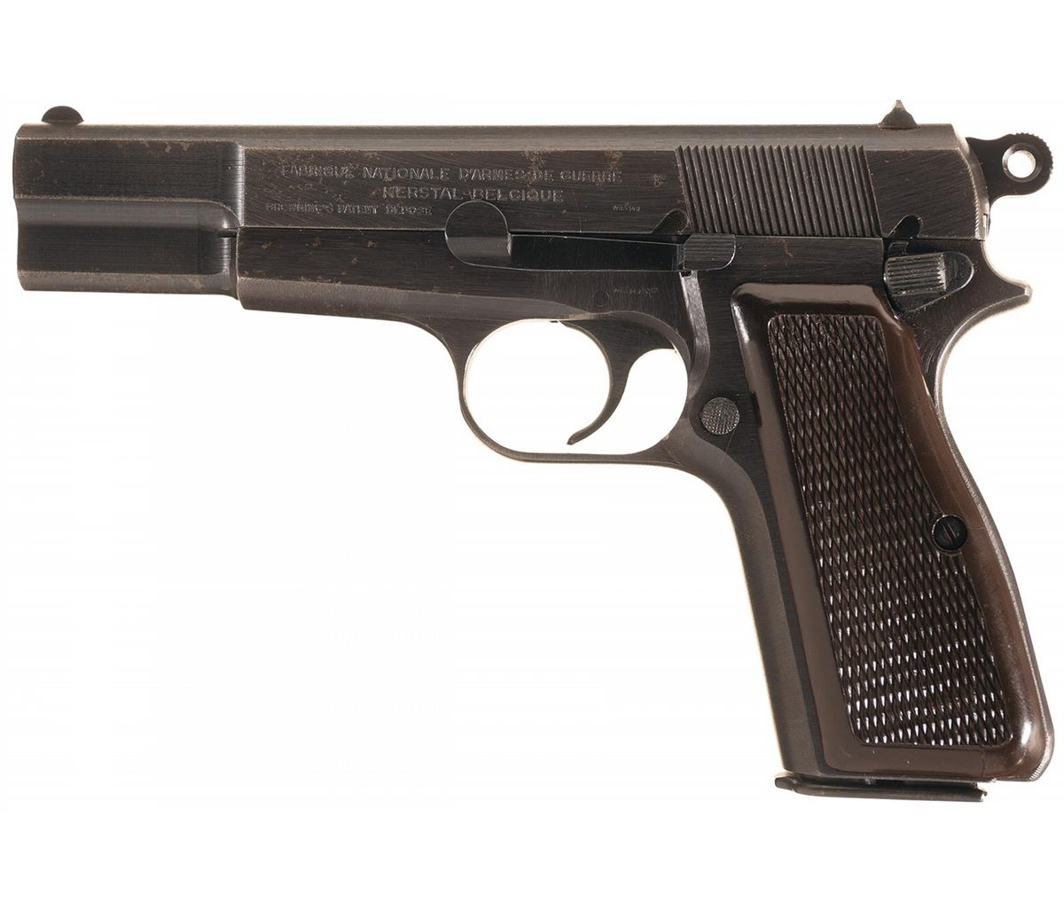 Manufactured during the German occupation of Belgium in World War II. Blade front and fixed rear sights, with the 2-line Herstal address over the Browning patent marking on the slide, "eagle/swastika" and "WaA140" proofs on the slide, barrel and frame, and stacked serial numbers on the right. Serrated ring hammer, smooth back strap and checkered plastic grips. With a brown leather flap holster, marked "clg/44" on the lower flap, and an extra magazine.