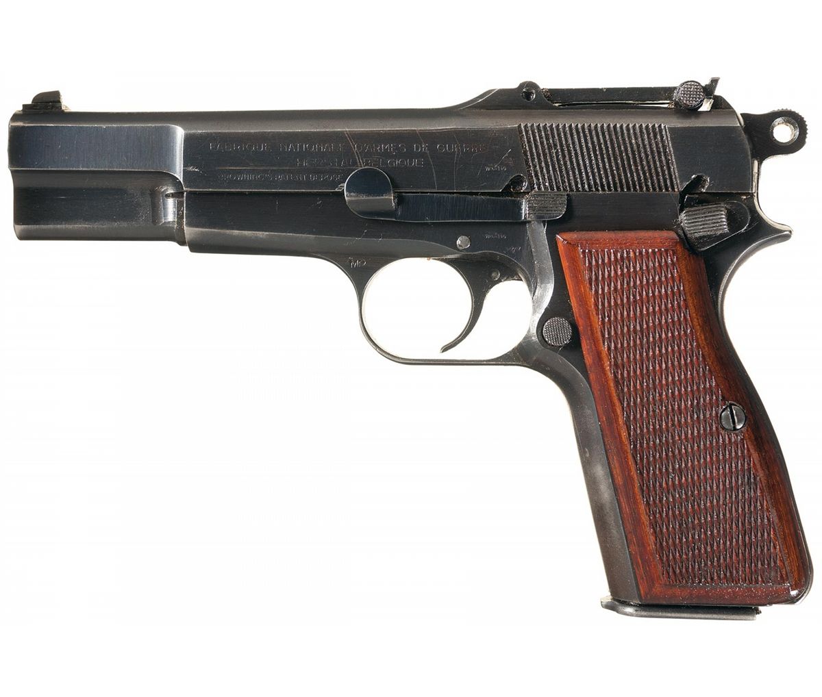 Manufactured during the 1940-1945 German occupation of Belgium. Blade front and tangent rear sights, with the 2-line Herstal address over the Browning patent marking on the slide, "eagle/swastika" and "WaA140" proofs on the slide, barrel and frame, and stacked serial numbers on the right. Serrated ring hammer, smooth back strap, checkered hardwood grips and an extra magazine.