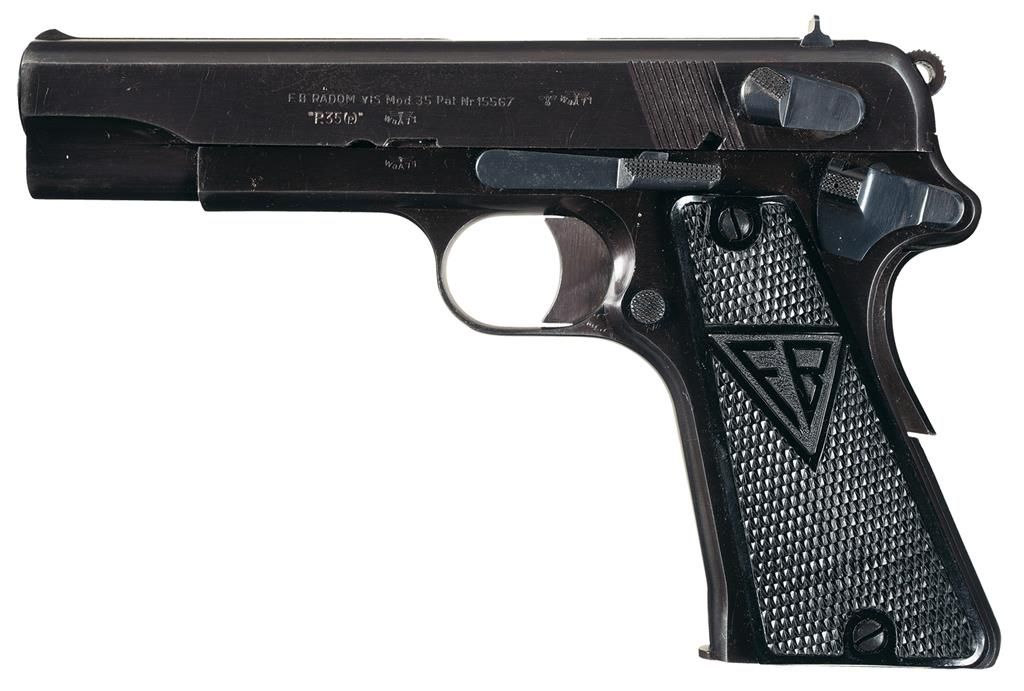 Originally the chief sidearm of Poland's military, the VIS 35 was rebranded the P35(p) and pressed into service by the Germans following their invasion and occupation of Poland. Fixed sights with the one-line Radom model marking, "WaA77" and "eagle/625" stamps, and ""P.35(p.)"" on the left side of the slide, a slotted back strap, takedown hook and checkered FB/VIS grips. Matching numbers are present on the slide, barrel and frame, with one "Eagle/189" marked magazine.