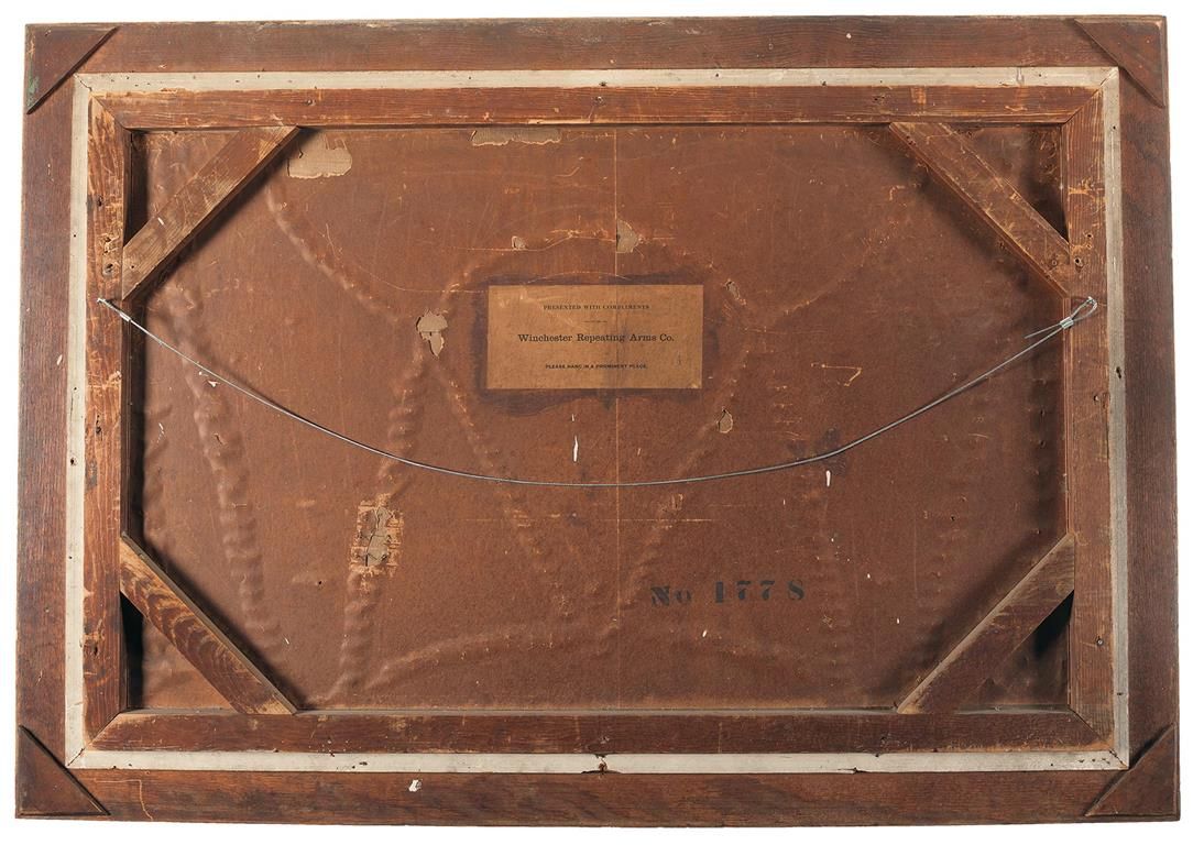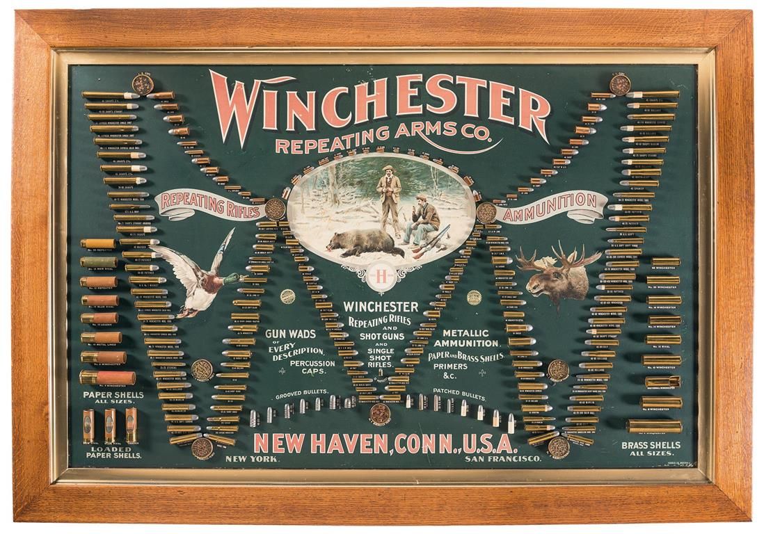 The board is mounted in 3 inch broad flat wood frame, 57 inches wide by 39 3/4 inches tall, with a gold painted border around the 48 1/2 inch by 31 inch green board. In the center is a vignette of two Winchester-armed hunters behind a dead bear in a woodland scene, which is flanked with a moose head and a mallard in flight. Over 100 cartridges, bullets and primer tins are arranged in the "Double W" pattern. Marked "FORBES CO. BOSTON" in the lower right hand corner, with a paper label on the back reading "PRESENTED WITH COMPLIMENTS/of the/WINCHESTER REPEATING ARMS Co/ PLEASE HANG IN A PROMINENT PLACE".