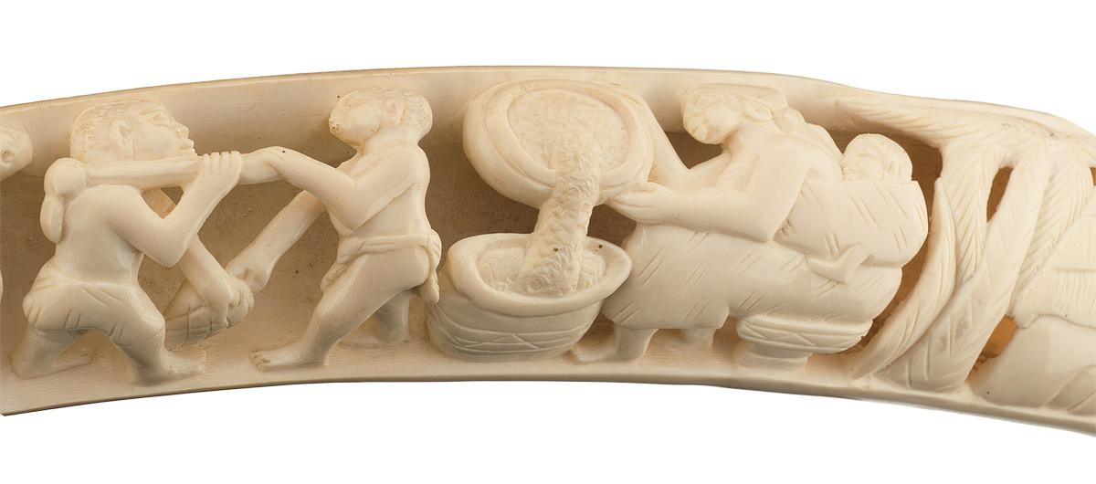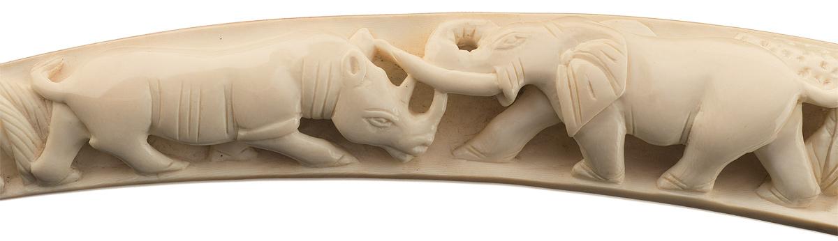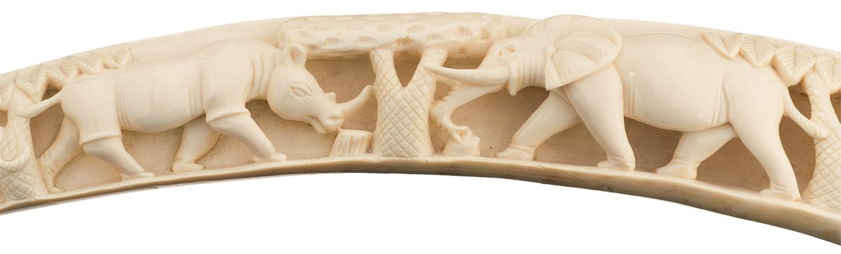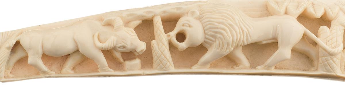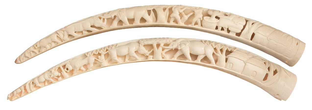 Both tusks are attractively colored, with three dimensional carved scenes cut clear into the center of the tusk. 1) Ivory tusk, 27 1/2 inch long, carved along the left side (from base to tip) with a set of three huts, a woman with a baby strapped to her back working with grain, two men cutting trees and a jungle scene of an elephant, rhinoceros, lion and gazelle. 2)Tusk 28 3/4" long, with a carved set of three huts, with an elephant, rhino, lion, water buffalo and a gazelle at the tip.