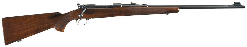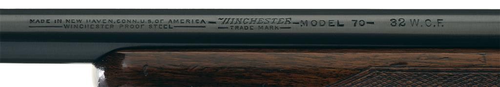 Manufactured in 1942. The rifle is chambered in 32 WCF, an extremely rare caliber that no example is shown in Dean Whitaker's study THE MODEL 70 WINCHESTER 1937-1964. The Model 70 was a very popular rifle with many custom variations having been manufactured. Whitaker notes that "the versatility of the rifle gave rise to many factory-sponsored or factory-sanctioned experimental chamberings and configurations." Factory records are, as Whitaker states, "rather scanty or, in some cases, non-existent." Hooded ramp front sight and elevation adjustable rear sight on a barrel marked with the Winchester legend followed by "32 W.C.F." (in the Model '92 serifed pattern) on the left side. The Winchester factory oval proof is stamped on the barrel and receiver. The receiver is tapped for scope mounting at the front and sight mounting on the left rear side. Pre-war safety, solid bolt knob, polished bolt numbered to gun, cloverleaf receiver tang and sling swivels. The straight comb pistol grip stock features checkering and is fitted with a checkered steel buttplate.