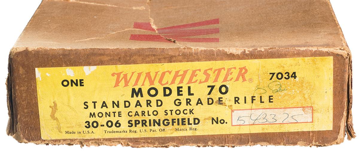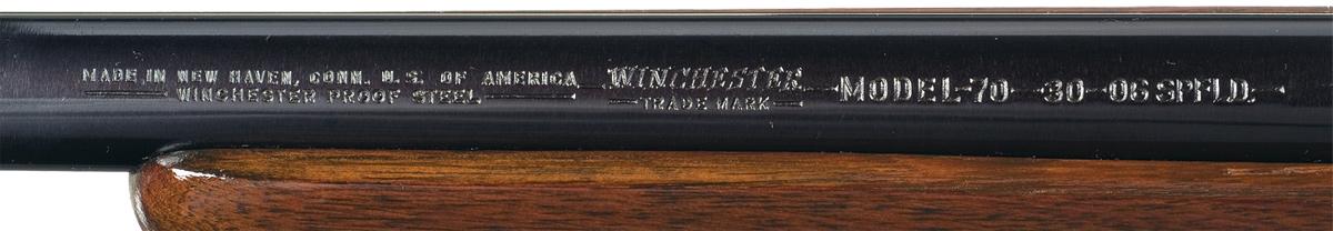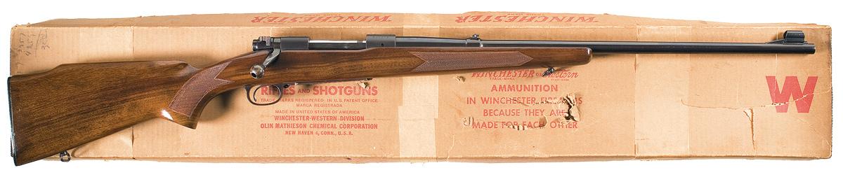 Manufactured in 1960, this rifle features a hooded raised ramp front sight and adjustable folding leaf rear sight. The left side of the barrel ahead of the rear sight is marked with the standard address, trademark, model and caliber marking. The left rear of the barrel and receiver are marked with the Winchester oval proof and the left side receiver wall is marked "WINCHESTER / --TRADE MARK--". Matte blue receiver and polished blue finish on the remaining parts, hinged floor plate and mounted with a one piece checkered walnut pistol grip stock with raised comb, checkered buttplate and sling swivels. Complete with the original box numbered to the gun, hanging tag and papers.