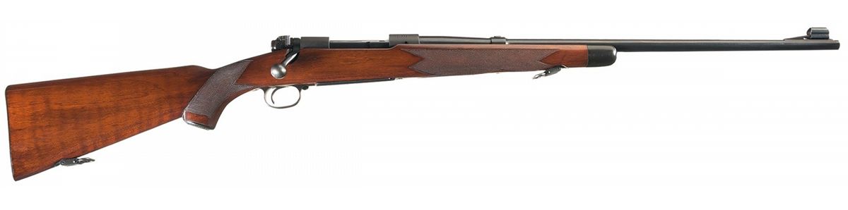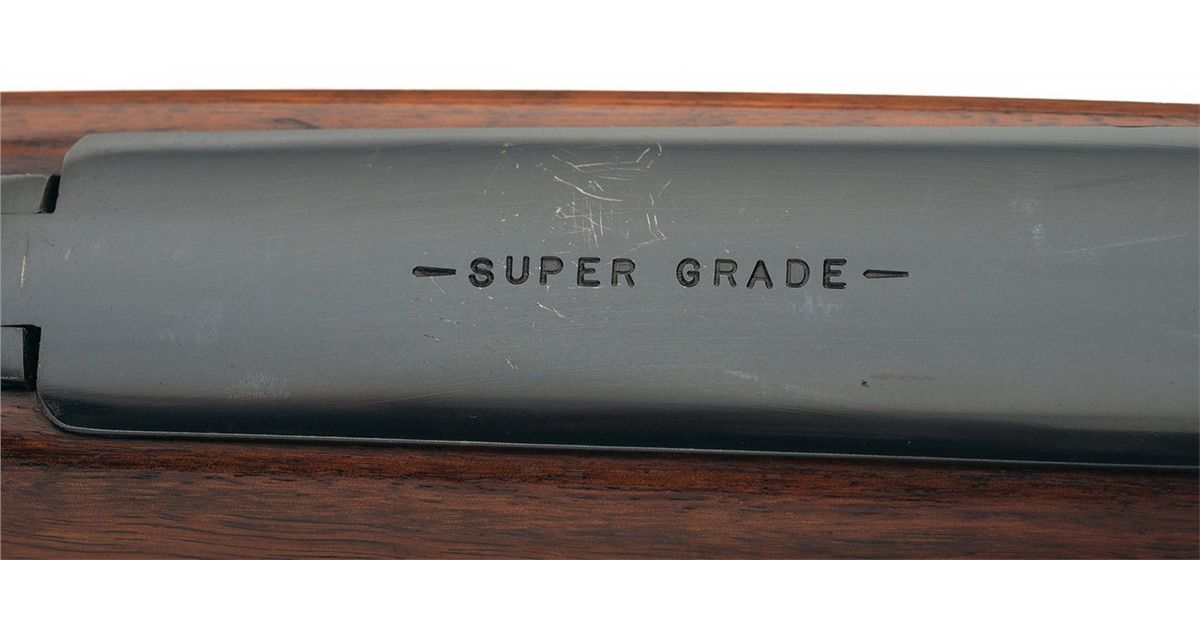 Manufactured in 1948 during the Transition period (1945-51). Hooded ramp front sight and a filler block in the rear sight slot with the receiver tapped for scope/sight mounting. Standard Winchester markings including the factory proof on the barrel and receiver at the breech and "-SUPER GRADE-" on the hinged floor plate. Late safety, straight receiver tang, quick release sling swivels, solid bolt knob and polished bolt numbered to the gun. The nicely figured pistol grip stock features multi-point checkering, ebony forend tip, hard rubber factory grip cap, cheekpiece, and checkered steel buttplate.