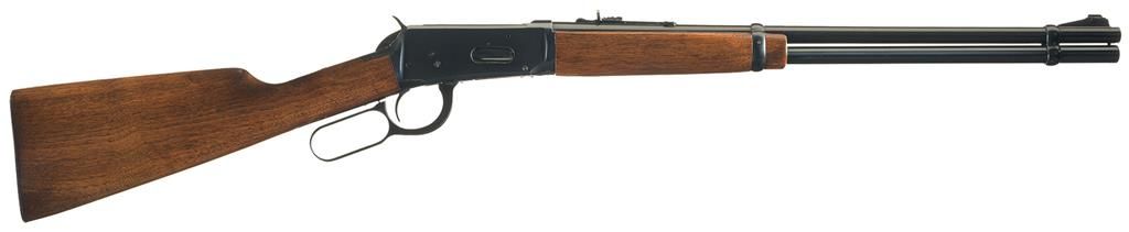 Manufactured in 1952. Standard barrel markings with the Winchester oval proof on the barrel and receiver, and the serial number on the bottom of the receiver. Ramped blade front sight (hood absent) and adjustable buck horn rear sight. All blue finish and mounted with a smooth walnut forearm and straight grip stock with a flat checkered buttplate.