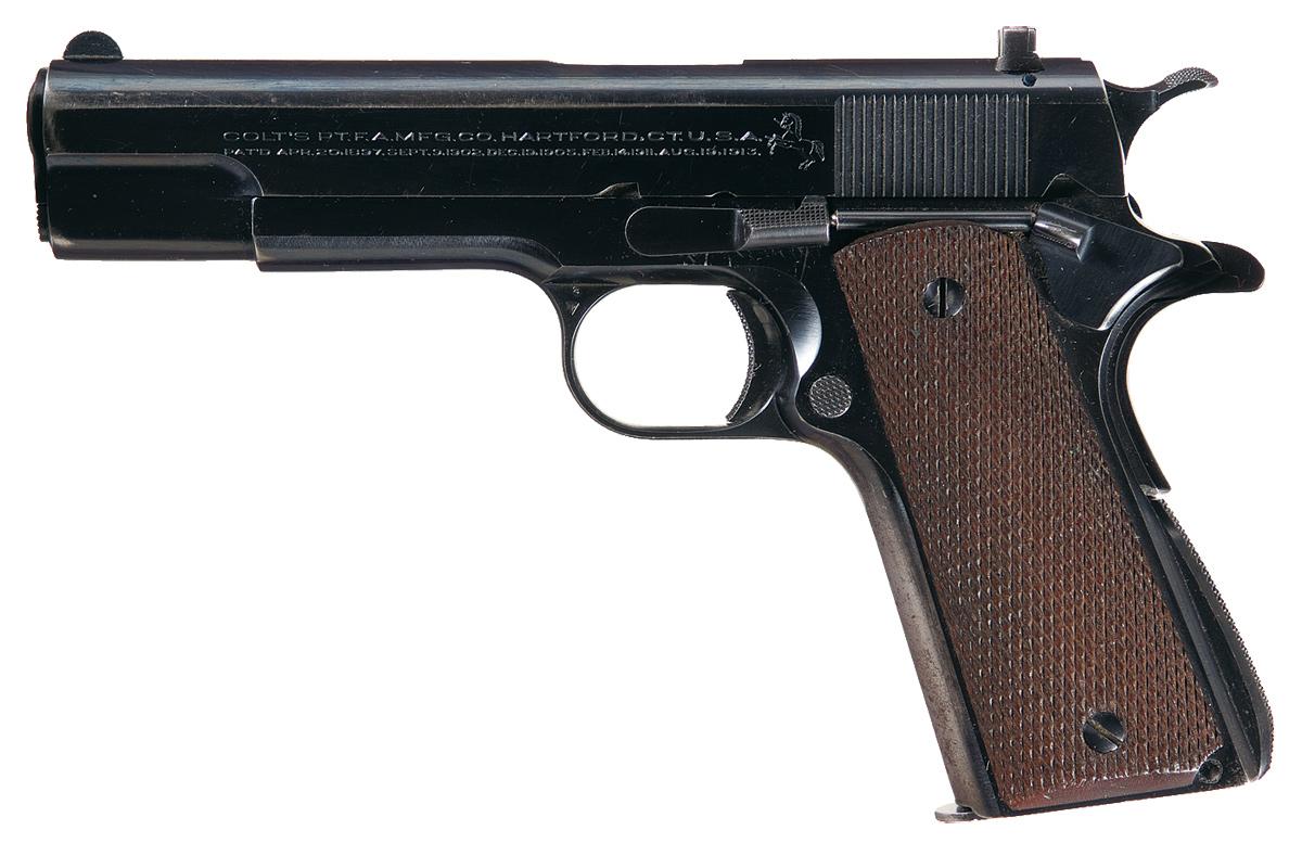This first year production Colt Ace Model semi-automatic pistol was manufactured in 1931. The left side of the slide has the standard two line address/patent dates marking with the model/caliber markings on the right side. Blade front and adjustable notch rear sights, with the arched mainspring, trigger, wide hammer, slide catch and thumb safety being checkered. Fitted with checkered grips and furnished with a two-toned magazine. The magazine has the model marking on the bottom.