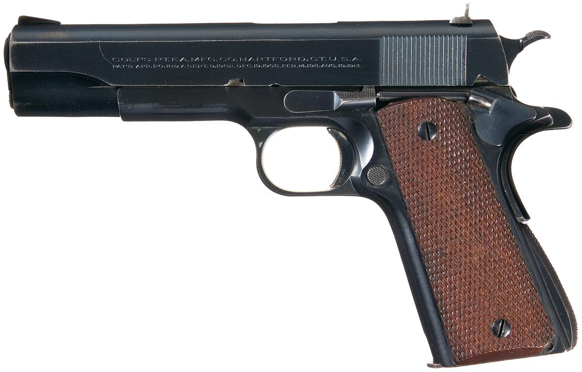 Condition: Excellent. The pistol retains 97% original finish with some minor wear on the muzzle end and high edges of the slide, some minor thinning on the grip safety and a few scattered minor dings, and light scratches. The grips are excellent with a couple of very minor nicks and dings with sharp checkering. The markings are crisp and clear. Period custom sights added as noted above. Mechanically excellent.