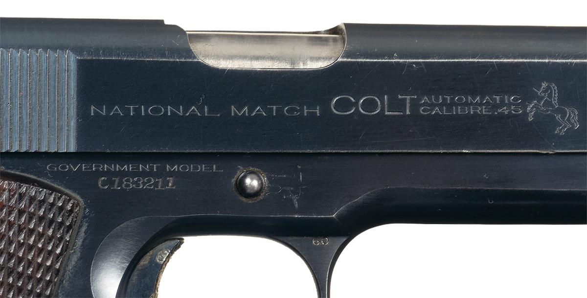 Manufactured in 1937. Blade custom front sight and large custom fixed notch rear sight on slide with the two line address and patent dates on the left side "NATIONAL MATCH COLT AUTOMATIC / CALIBRE.45" on the right followed by the Rampant Colt, and the serial number on the right side of the frame below "GOVERNMENT MODEL". Barrel marked "M.B." in a circle on the left side of the lug and the slide is numbered to the gun. Wide checkered spur hammer, milled checkered trigger, arched checkered mainspring housing, "P/ VP" on the left side of the trigger guard, 60" on the right. Two tone unmarked magazine and fitted with checkered walnut grips.