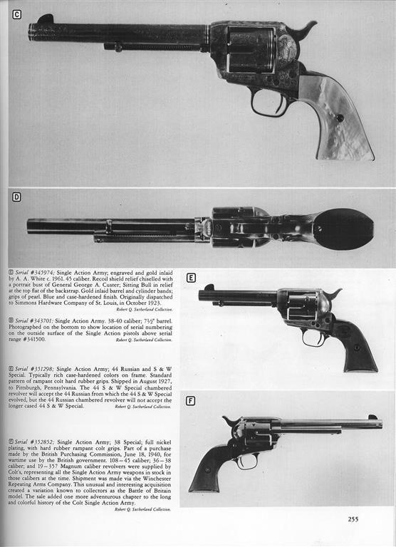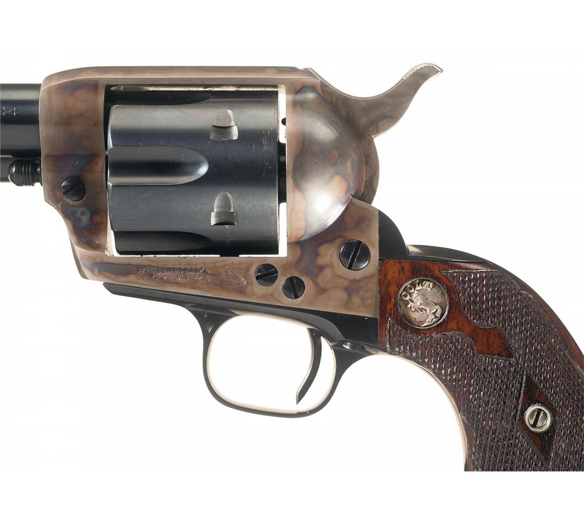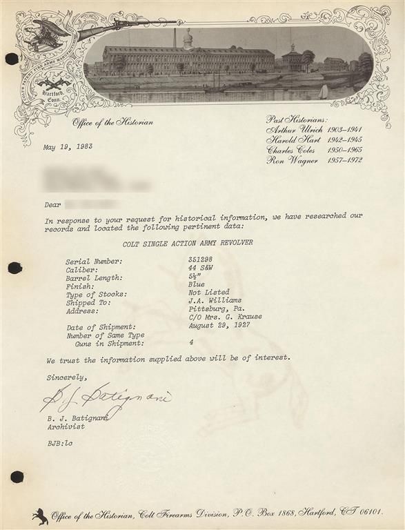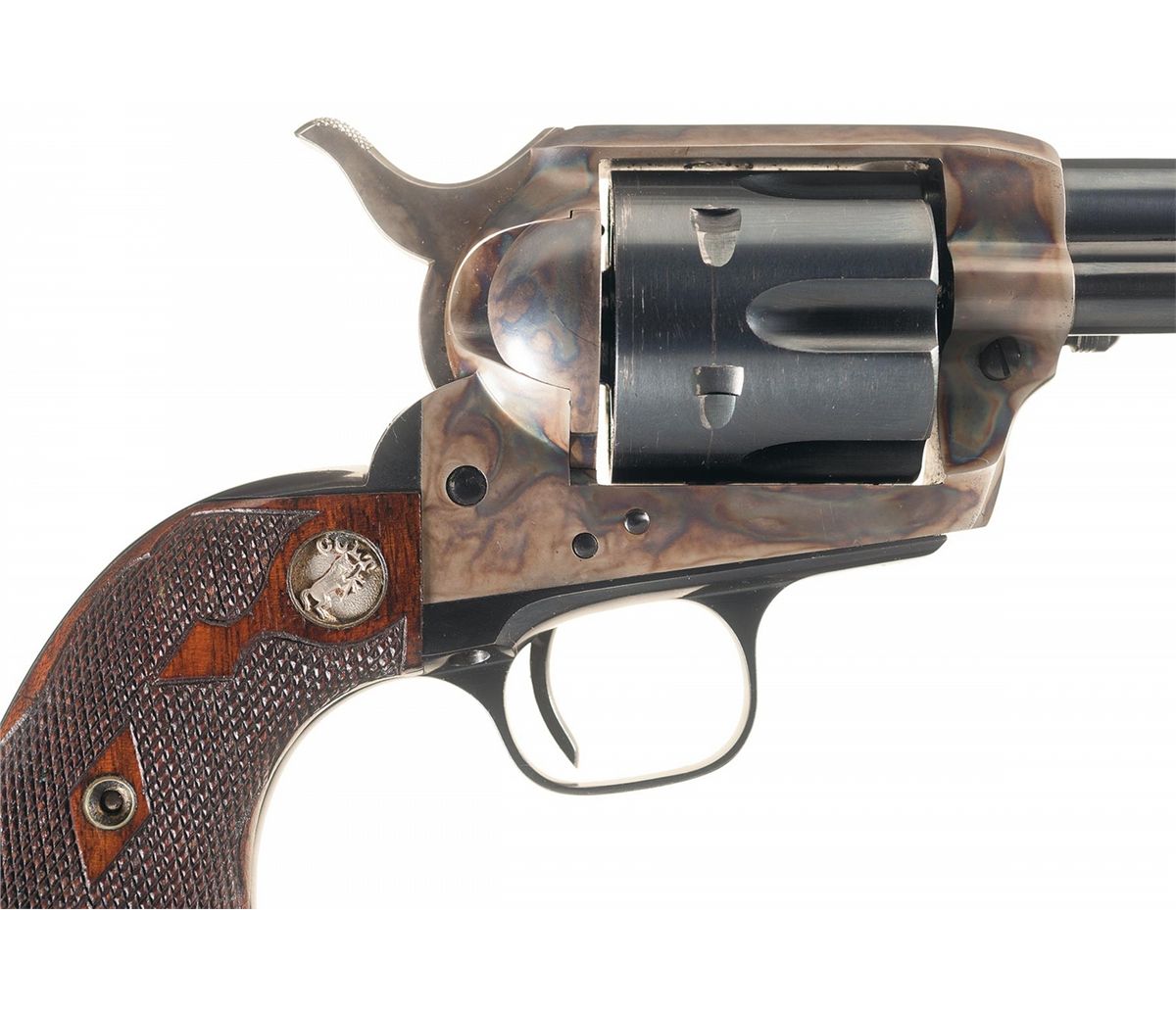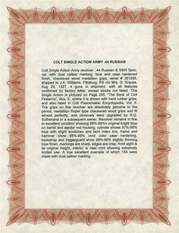 This is an excellent example of a pre-war Colt 44 Russian Single Action Army Revolver with Colt factory letter. The letter describes the revolver as 44 S&W with 5 1/2 inch barrel and blue finish. It states that the revolver was shipped to J..A. Williams of Pittsburg, Pennsylvania on August 29, 1927. This revolver is illustrated and described on page 255 of "THE BOOK OF COLT FIREARMS" by R.L. Wilson. The revolver has the Colt pre-war commercial blue finish on the barrel, ejector housing, cylinder, trigger guard and back strap. The frame and hammer have vivid case colors. The ejector housing has the late oval head and the hammer has borderless knurling on the spur. The revolver has two piece walnut special order checkered grips inlaid with German silver Colt medallions. The left side of the barrel is roll stamped with the rare dual caliber marking "RUSSIAN AND/S&W SPECIAL 44" in two lines. Only 154 Colt Single Action Army revolvers chambered for the 44 S&W Special and 44 Russian cartridges had these markings. The top of the barrel is roll stamped "COLT'S PT. F.A. MFG. CO. HARTFORD CT. U.S.A." in one line. The left side of the frame is roll stamped with the Colt two line, three patent dates followed by the Rampant Colt. The inside of the loading gate is stamped with the assembly number "671". The assembler's mark "3" and the Colt Triangle "V/P" proof mark are stamped on the left front trigger guard bow. The serial number "351298" is stamped on the bottom of the frame.