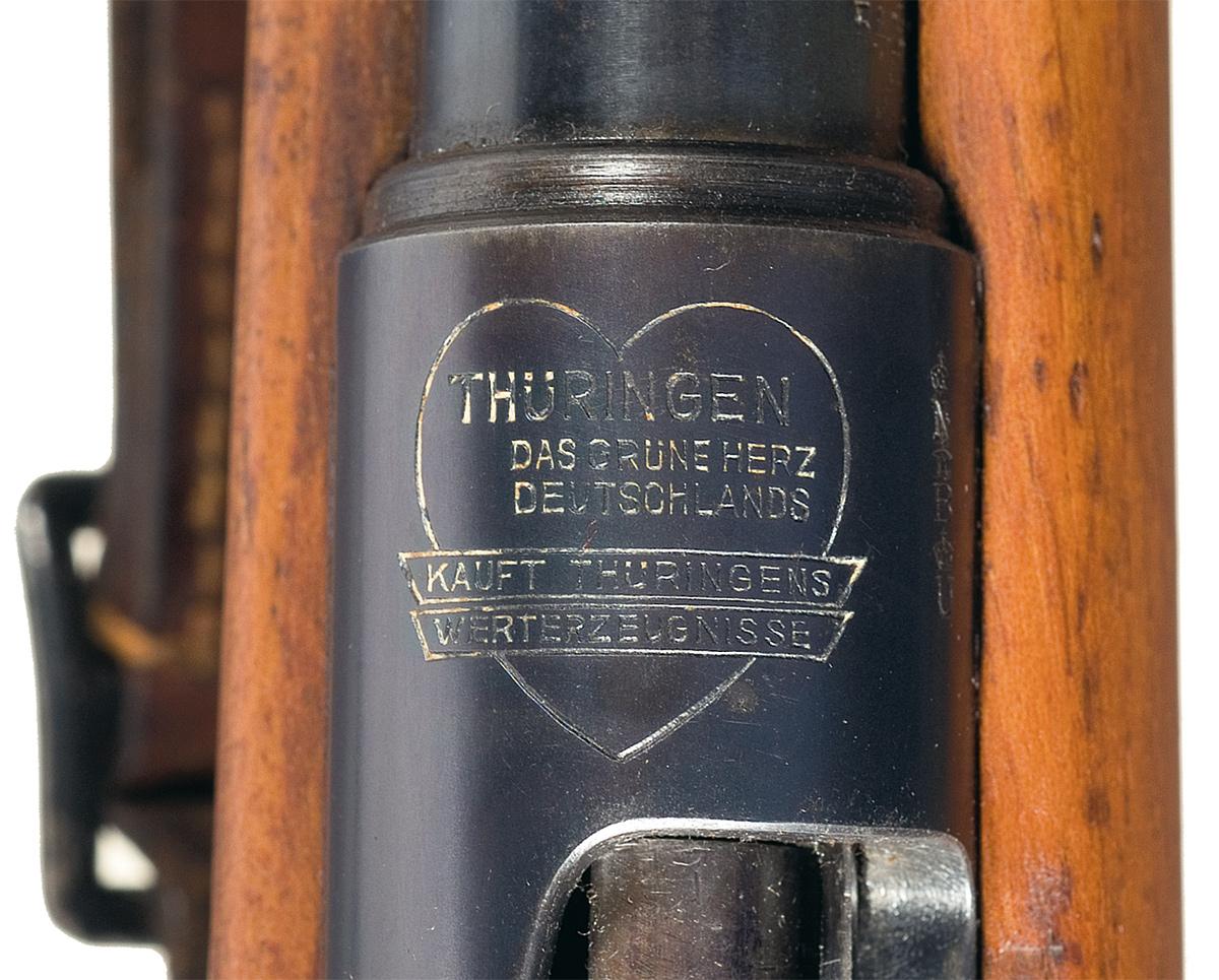 The chamber is marked "THURINGEN / DAS GRUNE HERZ / DEUTSCHLAND" over "KAUFT THURINGENS / WERTERZEUGNISSE" in two banners. Blade and tangent sights, with caliber marking on the barrel, "crown/ letter" proofs, and "Deutsches Sportmodell" on the right side of the receiver and "WAFFENFABRIK HERM. WEIHRAUCH / ZELLA-MEHLIS THUR." on the left side. Smooth straight grip stock, with a flat buttplate and a brown leather sling. A metal muzzle cover is included.