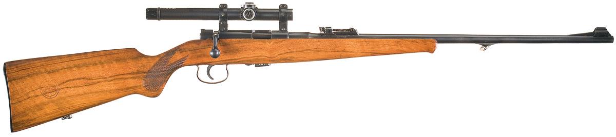 This is a pre-war Mauser sporting rifle with the scarce clip feed action. The left side of the receiver is marked with a crown "U" and "B" proof mark, followed by the serial number and "MAUSER WERKE A.G. OBERNDORF A.N.". The left rear of the barrel is marked "PATRONE 22 LONG RIFLE" directly below the rear sight, with the matching serial number and "459" and crown over "B", "G" and "U" proofs at the breech, and "D.R.P.D.R.G.M." on the right side directly below the rear sight. The top of the receiver is grooved for scope mounting and the rifle is equipped with a Hensoldt 2 1/2x17.5 scope. Hooded ramp blade front sight and tangent rear sight graduated to 200 meters. Mauser marked detachable magazine, serrated trigger, checkered trigger guard and mounted with a one piece round knob pistol with smooth forearm and checkered wrist, Mauser banner stamped on the right side, checkered Mauser buttplate and sling swivels.