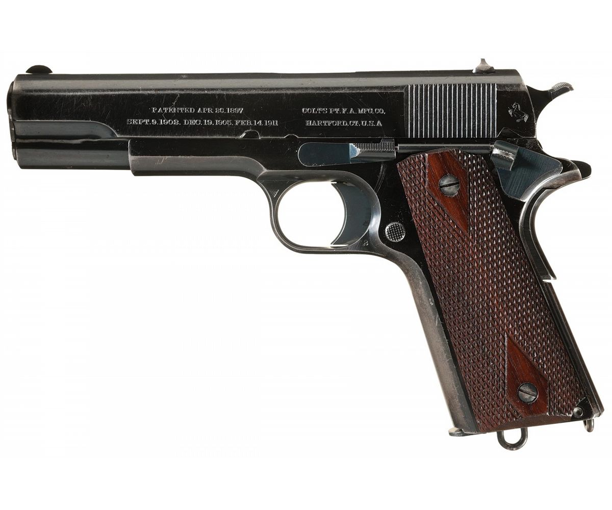 This is an excellent example of an early Colt commercial Model 1911 Government Model pistol manufactured in mid 1914. Based on the early success of the standard military Model 1911 pistols Colt marketed a commercial version. These early Colts all exhibited the desirable high polish blue finish with checkered walnut grips. The left side of the slide has the early two line, two block Colt patent and address marking "PATENTED APR. 20. 1897/SEPT. 9.1902. DEC.19.1905. FEB.14.1911" and "COLT'S PT. F.A. MFG. CO./HARTFORD.CT.U.S.A." all in the early serif letters and numbers with the Rampant Colt behind the slide serrations. The right side of the slide is marked "COLT AUTOMATIC/CALIBRE 45", the right side of the frame is "GOVERNMENT MODEL" over the serial number "C5730". It is fitted with all the early parts that consist of the early style rounded rear sight, checkered slide stop release, early 1914 thin pattern checkered thumb safety, wide checkered Colt hammer with the long smooth trigger and flat mainspring housing. The barrel is an early blue unmarked Colt commercial model with the polished chamber area. It is fitted with the early diamond pattern checkered grips, and two tone blue magazine with lanyard loop on the bottom and lanyard loop on the frame heel.