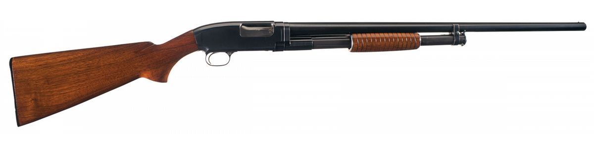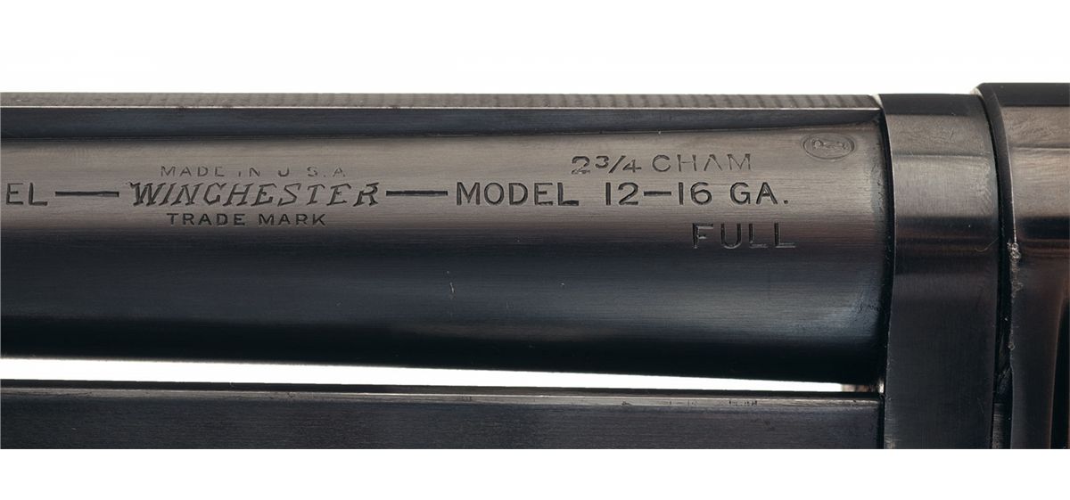 Manufactured in 1939. Single bead front sight on the matte solid rib, 2 3/4 inch chamber and choked full. Standard left rear barrel markings, with the Winchester oval proof off set to the left of the barrel and on top of the receiver at the breech. Mounted with a 14 groove forearm and smooth pistol grip stock with checkered Winchester hard rubber buttplate. Length of pull is 14 inches.