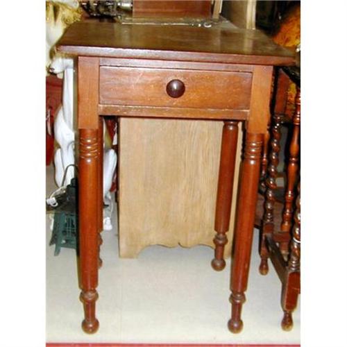 Outstanding primitive dark wood - could be cherry, but not sure - stand or end table. The top shows its age with many marks, scratches. Legs are well designed. May have been cleaned up inside the drawer. Buyer pays shippiing and handling costs.