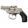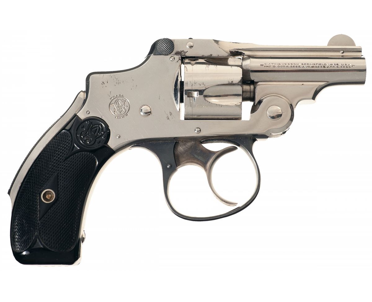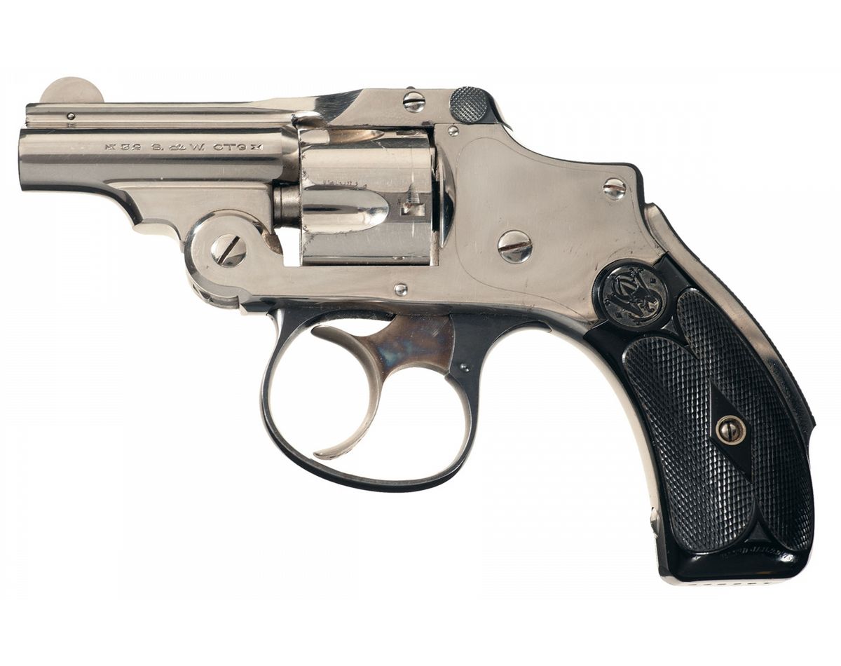 Manufactured from 1902 to 1909 this 2nd Model 32 Safety Hammerless revolver is fitted with a rare 2 inch barrel, also called the "Bicycle Gun". The left side of the barrel has the caliber marking flanked by Maltese crosses and the right side of the barrel has the two line address/patent marking. Right side of frame has the S&W trademark. Matching numbers on butt, cylinder, barrel and latch. Fitted with checkered S&W monogram grips which are numbered to the gun.