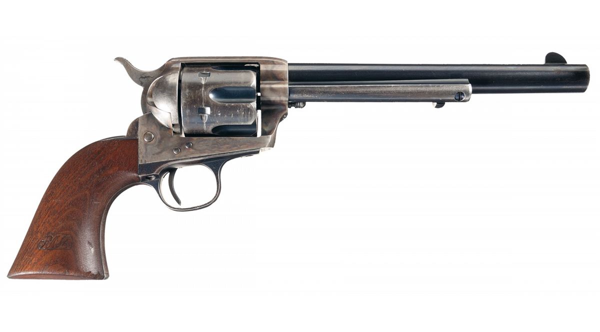 Colt Single Action Cavalry Model revolver manufactured in 1890 under the 12th Ordnance contract. 1890 was the next-to-last year of production for U.S. contract Single Action revolvers. The revolver was inspected by Ordnance Sub-Inspector Rinaldo A. Carr (R.A.C.) and Captain Stanhope E. Blunt (SEB). It has the Colt military blue finish on the barrel, ejector housing, cylinder, trigger guard and back strap. The frame, loading gate and hammer have a color casehardened finish and the one-piece walnut grip is oil finished. The revolver has the oval ejector housing adopted about serial number 113,000 and the "cavalry style" hammer with elongated, bordered, knurling on the spur. The top of the barrel is roll-stamped with address "COLT'S PT. F.A. MFG. Co. HARTFORD CT. U.S.A.-" in elongated block letters. The left side of the frame is roll-stamped with the Colt three-date/three-line patent markings followed by the "U.S" property mark. The Sub-Inspector's initials, "R.A.C." are stamped on the underside of the barrel, the bottom of the frame above the serial number, on the side of the cylinder and on the left heel of the grip. A "K" Colt sub-inspection mark is stamped on the trigger guard, the back strap, on the front of the ejector housing and on the barrel behind the ejector housing stud, with "P" proof marks stamped on the underside of the barrel, in front of the "R.A.C." sub-inspection mark and on the side of the cylinder. The full serial number, "132215" is stamped on the bottom of the frame, trigger guard and back strap. The partial serial number. "2215", is stamped on the barrel beneath the ejector housing and on the side of the cylinder. All of the visible serial numbers match.The assembly number, "848", is stamped on the inside of the loading gate. The lower left side of the grip is stamped with the date "1890" above the script initials "SEB" enclosed in a rectangle with rounded edges. The script sub-inspection mark, which consists of the script initials "RAC" in a rectangle is stamped on the lower right side of the grip. With a John A. Kopec letter dated March 1st, 1999 stating it was a new listing and that it was probably issued to the 8th Cavalry. There are a few minor deviations from originality, the trigger is a replacement, the mainspring has been ground for a better trigger pull and the grip strap has been drilled for a grip pin.
