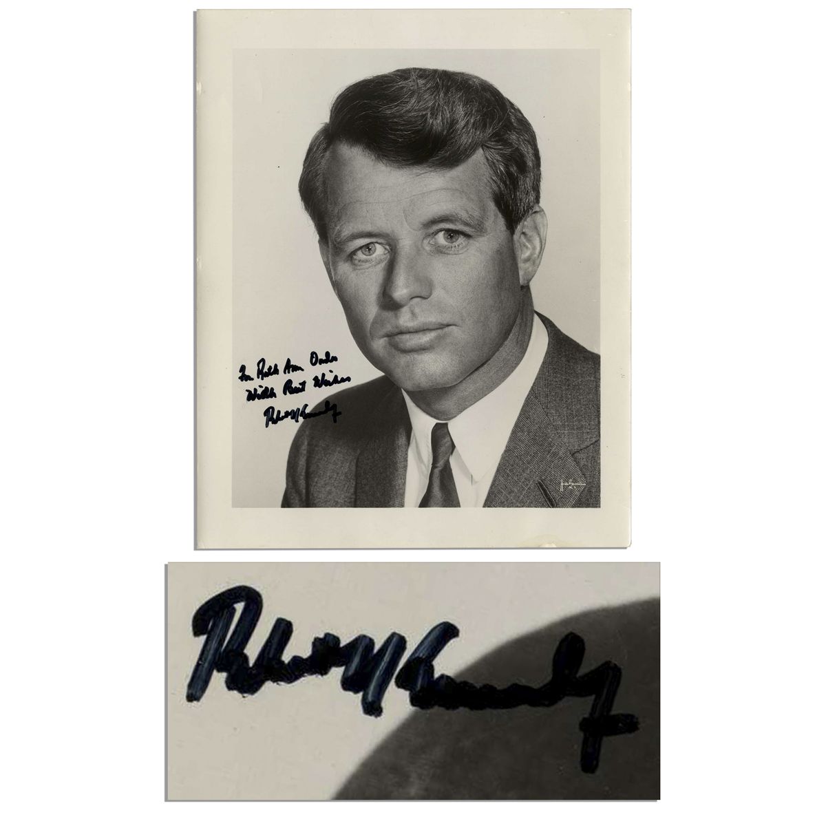 Robert Kennedy photo signed. Black and white bust portrait of Bobby in a suit and tie is inscribed over his right shoulder, ''For Ruth Ann Ordo / With Best Wishes / Robert Kennedy'' in black felt tip. Glossy image measures 8'' x 10''. Near fine overall.