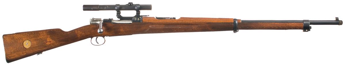 The top of the receiver ring is marked "WAFFNFABRIK, MAUSER OBERNDORF A/N 1900", (exactly as noted for the Luxembourg Model 1900 rifle) in "Mausers of the World pg. 147). The rifle is equipped with a Carl Zeiss scope on a short rail mounting system. The top rear of the scope is marked with the Zeiss logo over "Zielkleln / Nr. 64519". These rifles have the nicely polished, rust blued parts, polish bolt, and heat blued trigger and bolt release mechanism. The stock and handguard are made of beech and the stock has the traditional brass stock disc listing the "Overslag Torpedo Str." and bore condition gaged at "0" as new. Blade front sight and tangent rear sight graduated to 600 meters. Based on our research these Mauser contract Swedish military rifles are highly sought after by Contract Mauser rifle collectors.