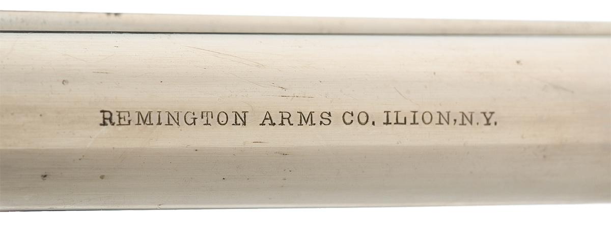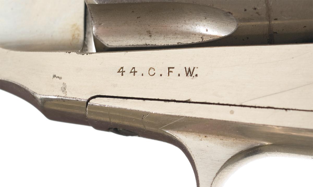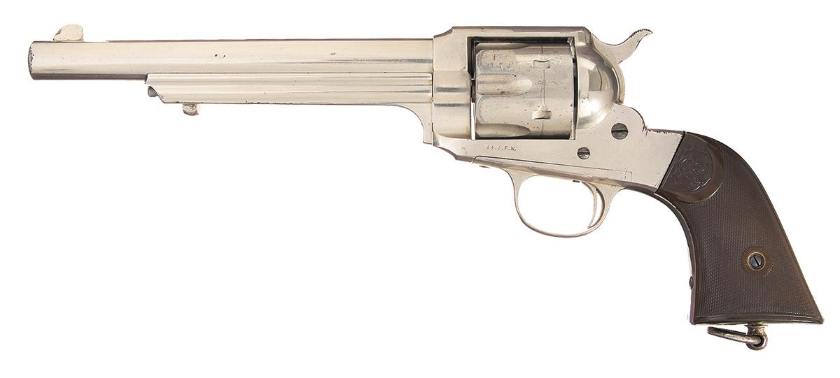 Remington only manufactured about 2,000 of the Model 1890 Single Action Army revolvers from 1891 to 1894. The Model 1890 was the successor to the Model 1875 and was intended to be the competitor of the Colt Single Action Army. This model of revolver is the most sought after of all of the Remington produced handguns. The top of the barrel is marked "REMINGTON ARMS CO. ILION, N.Y." and "44 C.F.W" is marked on the left side of the frame just below the cylinder. The serial number is marked on the lower left side of the frame under the grip panel and on the loading gate. The revolver has a blade front and frame notch rear sights, lanyard stud and ring mounted on the butt and is fitted with checkered hard rubber grips with the "RA" monogram at the tops.