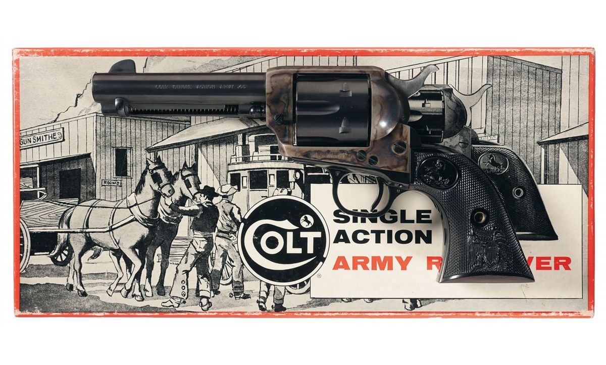 Manufactured in 1970. One line address on top of the barrel, "COLT SINGLE ACTION ARMY .45" on the left side and the left side of the frame is marked with the two line, three patent dates followed by the Rampant Colt. The matching serial number is marked on the bottom of the frame and on the left side of the grip straps under the grip. Matching assembly number "164" on the right rear of the frame and on the loading gate. Blue finish with casehardened frame, blade front and frame notch rear sights, and fitted with black checkered Rampant Colt/American eagle relief grips with "854" on the inside of each panel. Complete with a Colt Stagecoach box.
