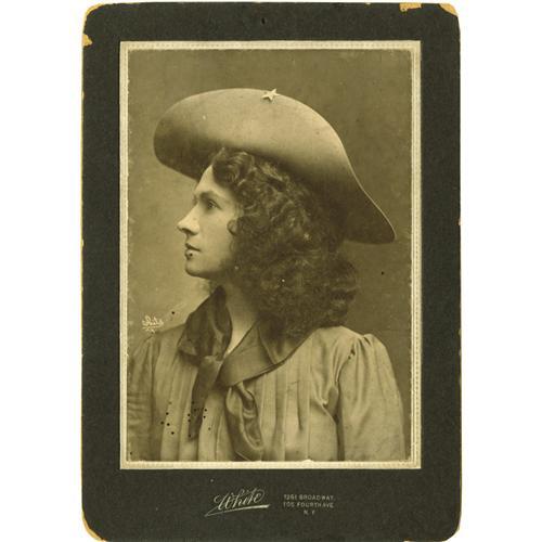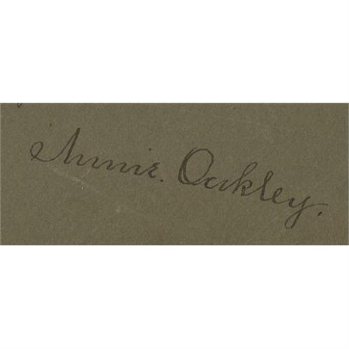 <B>Excellent Annie Oakley Signed Photograph</B></I> "<I>To Robert With Kind Wishes from Annie Oakley</B></I>" on back of photo, 7.5" x 5 " White Photography Studio, New York. Noted on the reverse, "The Western Girl 1902 & 1903." The Adopted daughter of Sitting Bull, nicknamed "Little Sure Shot," and star of Buffalo Bill's Wild West Show, Annie dazzled crowds by shooting the centers out of dimes in mid-air, and shooting playing cards on edge at 90 feet, then hitting them five more times as they fell. She routinely shot the ashes off her husband's cigarettes, while in his mouth, as part of the Butler / Oakley act. Annie played a significant role in breaking down barriers to women in entertainment. In her lifetime, she overcame poverty, mistreatment, physical injury, the childhood death of her parents, and a lack of formal education to become a legend in her own time. She remains a household name today. Only a few of these have come to market in recent years, so take your best shot!