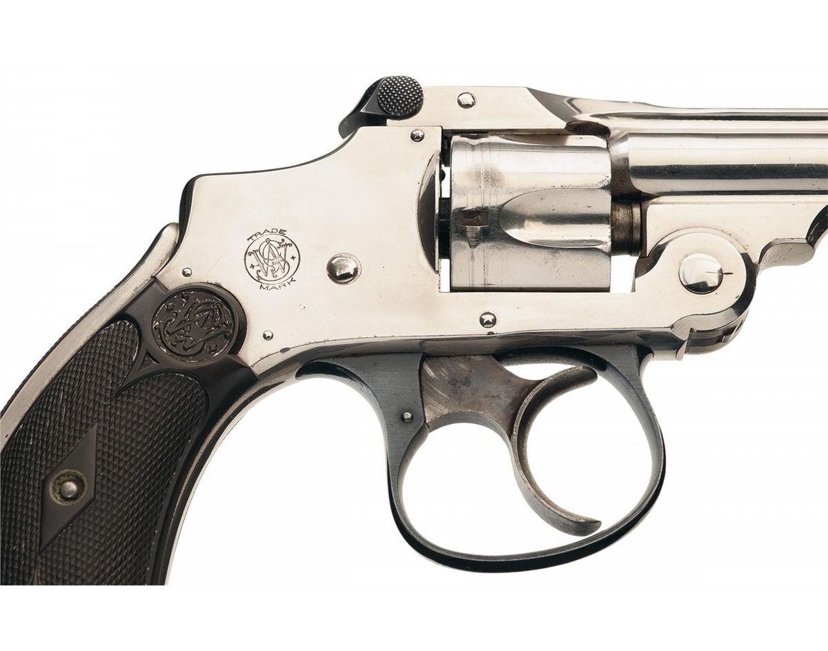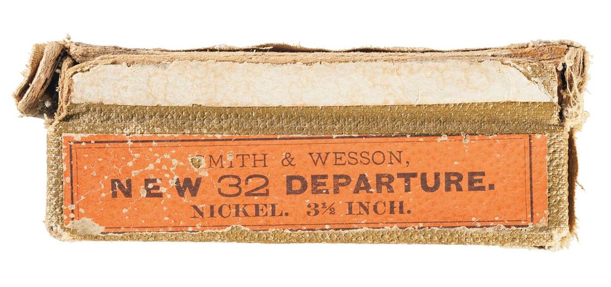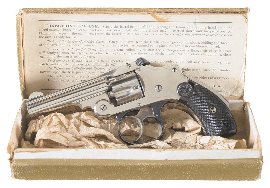 Manufactured from 1909 to 1937, this 3rd Model 32 Safety Hammerless features the standard barrel and frame markings, an integral front blade sight, notched rear sight, five round cylinder, nickel finish with blue trigger guard and casehardened trigger and fitted with checkered hard rubber grips with the "S&W" logo at the top. Complete with a S&W New Departure box but with an end label for a 3 1/2 inch barrel variation.