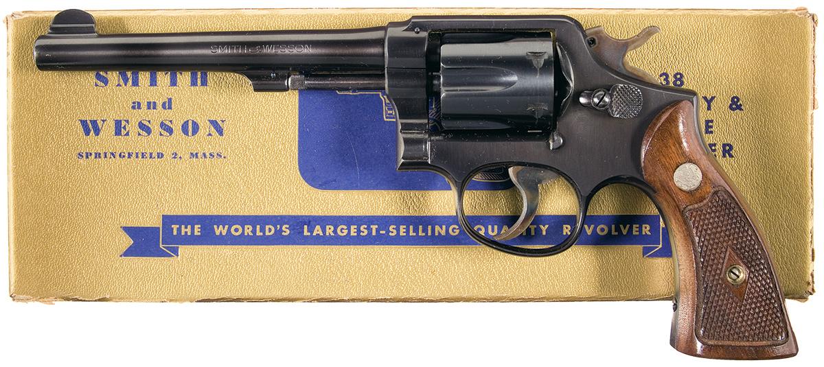 Manufactured circa 1948-'51. The revolver has the standard marking and frame notch rear sights, all blue finish with casehardened hammer and trigger, and fitted with checkered magna grips with S&W medallions. Complete with a correct gold two piece box for gun with nickel finish and the original hanging tag.