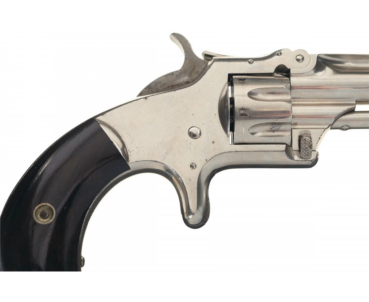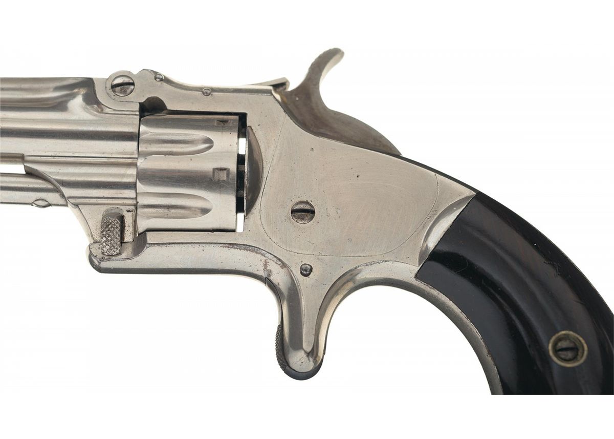 Manufactured from 1868 to 1881. The top of the barrel rib is marked with the one line address and patent dates and the matching serial number is marked on the butt and stamped on the inside of the right grip panel. The matching assembly number "55" is marked on the frame under the grip, front face of the cylinder and on the back of the barrel lug. Fitted with smooth bird head grips.